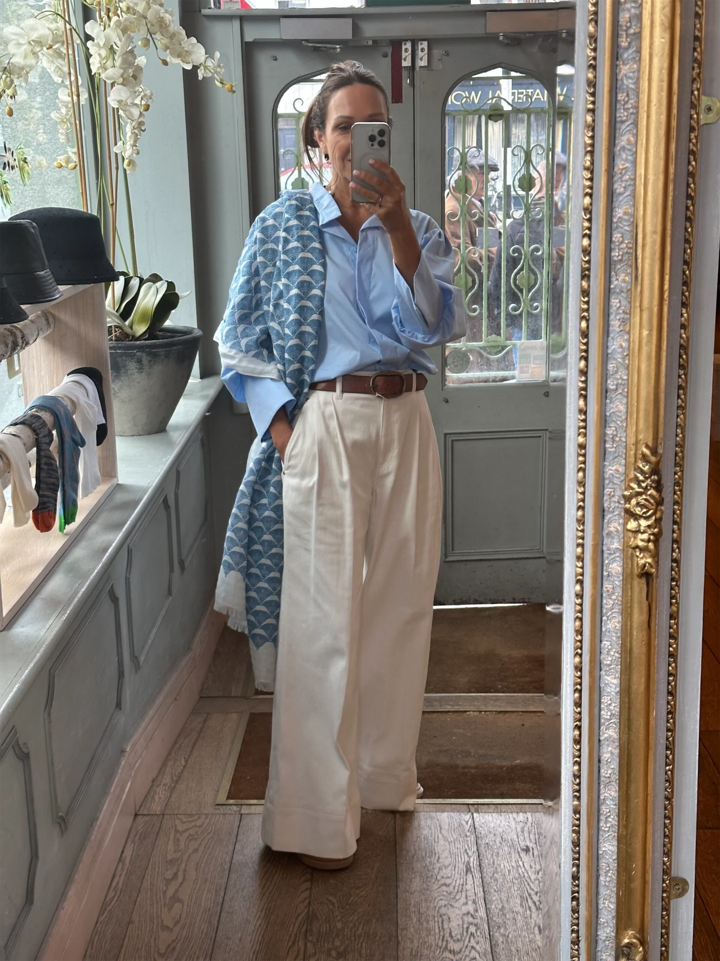 Today I am wearing trousers that I bought way back in February last year. I just love a wide-leg trouser. These in particular are a lovely soft cotton denim blend. I wear them on repeat, they have become a part of my go-to uniform. Both the shirt and trousers are from a fabulous Belgian brand called Natan which is stocked in Emporium Kalu. I love the classicness of this outfit, the sharp blue in contrast with the white is such a lovely summery pairing. The quality of the shirt is so beautiful and the sleeves have such wonderful details. My belt is one I’ve had for over 10 years from Massimo Dutti. I have on platform white Russell and Bromley trainers with this look. I get such great wear out of them, I had to buy a second pair! My beautiful earrings are from Irish designer Melissa Curry. They are so light and they add such a playful touch to any look. To tie my shirt and trousers together, I am wearing a lovely patterned scarf from Sian Jacobs in cornflower. It picks up the colours of both pieces and gives the look great harmony.