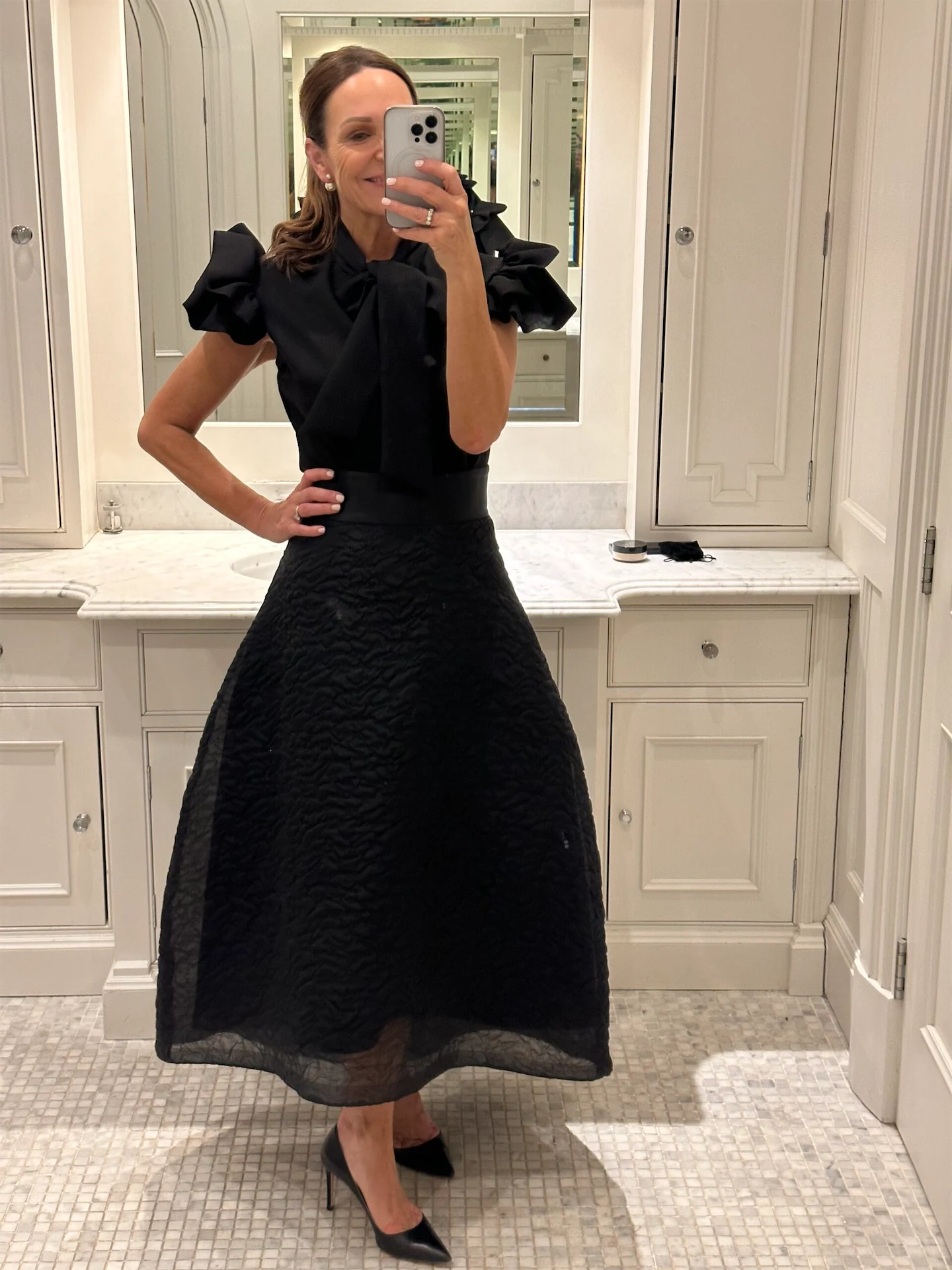 This look is for an evening event with Boodles jewellery. I absolutely adore this outfit. It is by Irish designer Sharon Hoey, from her company And Tate. I just love the elegance and shape of this skirt. The fabric is just incredible and the buckram binding at the bottom allows the skirt to hold its fabulous shape. It is a super light fabric, so easy to wear with such a lovely texture. Here I have paired the skirt with a magnificent And Tate blouse. I love the drama of the ruffle gathered sleeve and the bow necktie – it’s super elegant and so timeless, perfect for tonight’s event. I finished the look off with Prada sling-backs, my ever-faithful Christian Dior earrings and a ponytail.
