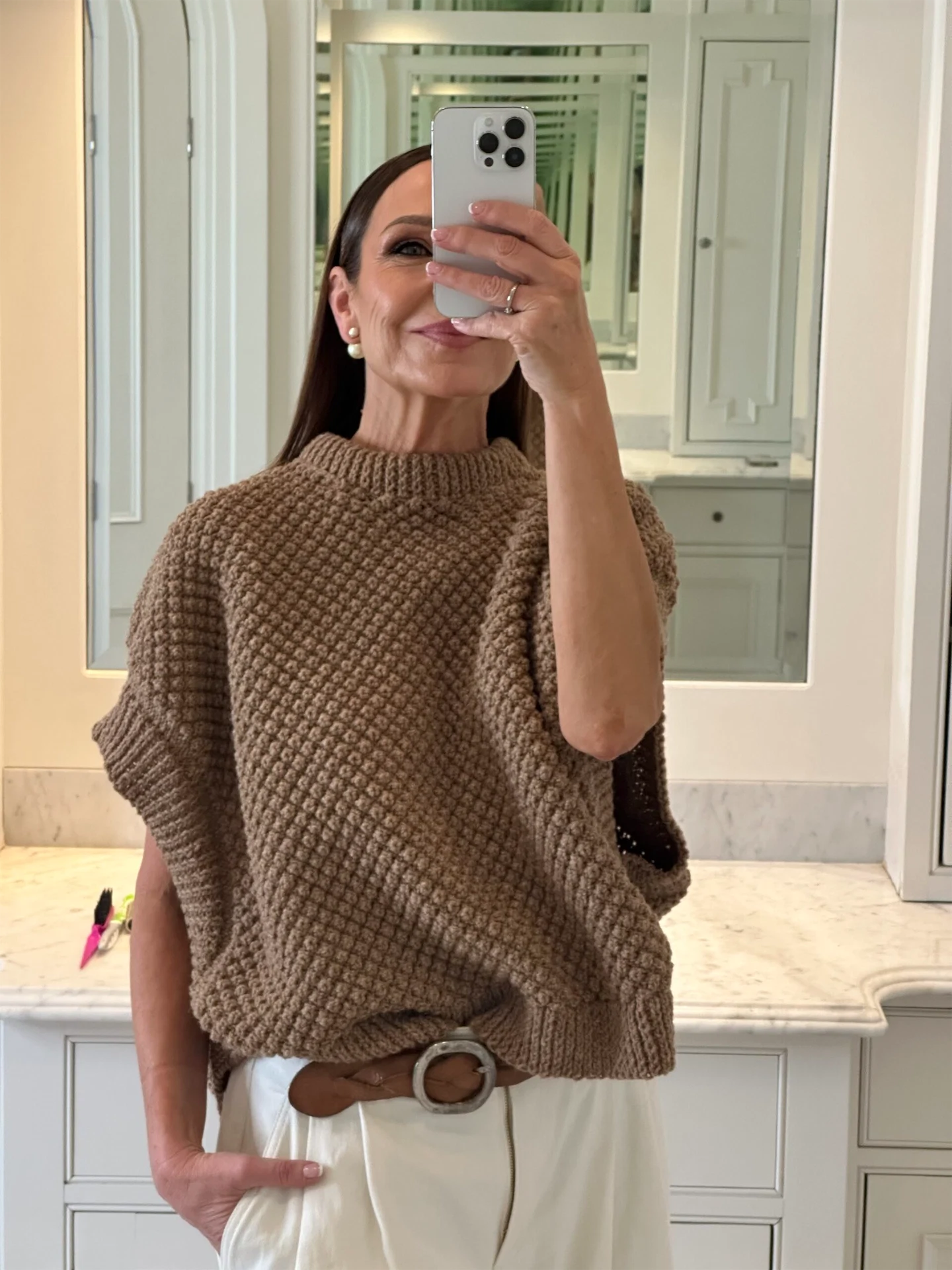 I am back in my wide-leg Natan trousers today – you can see I wear them on repeat, they are so versatile! Today I have paired them with a Conor O’Brien sand coloured Blackberry Gilet. I absolutely fell in love with Conor’s work the first time I came across him on Instagram. He is an NCAD graduate, who is reimagining Irish knitwear and giving it a contemporary feel. All of his pieces are handmade in Ireland and finished by him. Every piece is created to order and he works with a very small team that is invested in modernising and honouring this Irish craft and its production. The stories that surround the pieces I wear are very important to me. I love how classic this gilet is, it can be worn in any season and is of such a beautiful quality. Here I have paired it with my Russell and Bromley trainers, my Massimo Dutti belt and my Dior earrings, which as you can see are staples of my wardrobe.