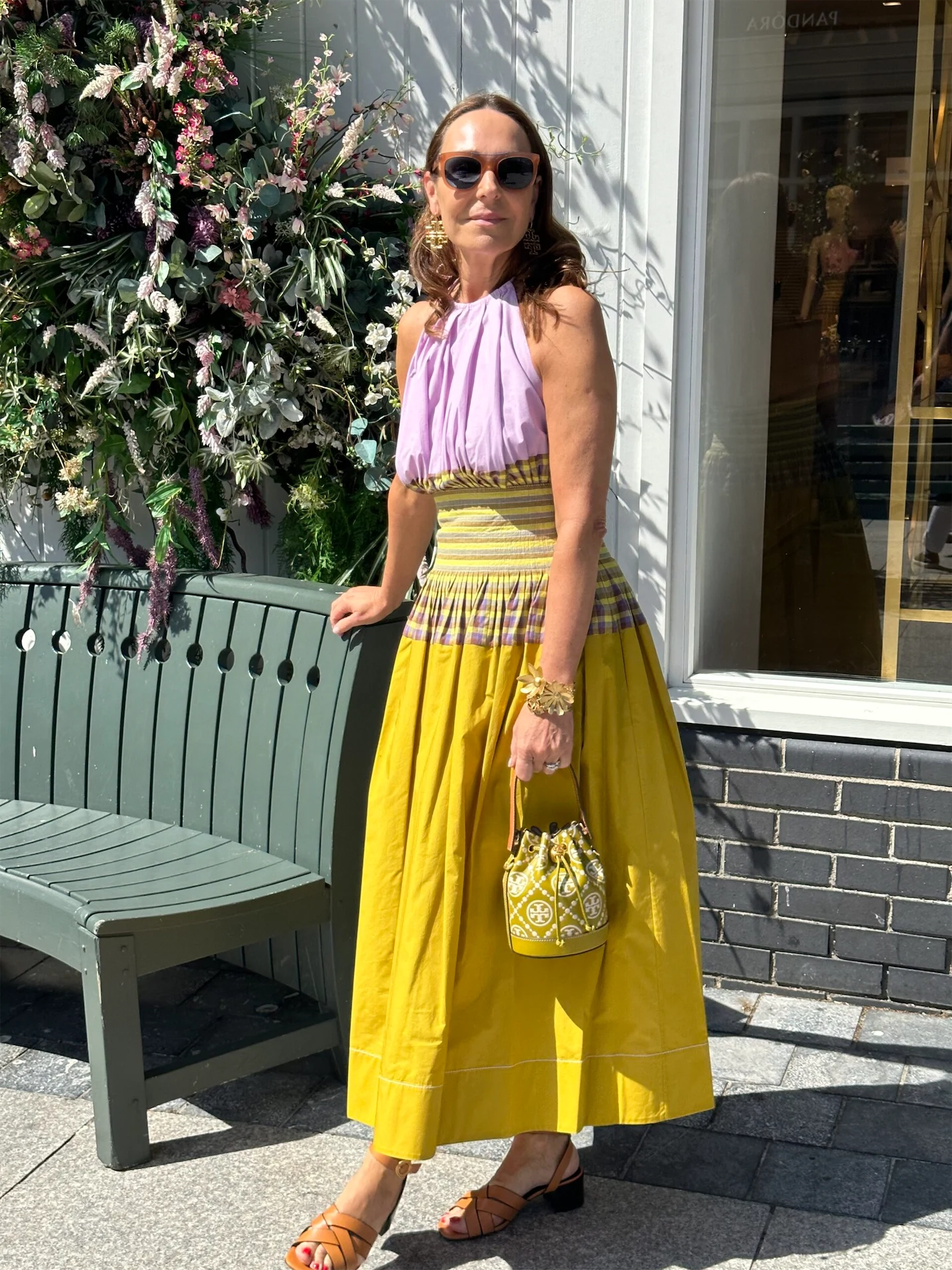 Today I’m in a fabulous dress from Tory Burch, taking advantage of one of the rare sunny days we get! I’m hosting a small work event at the Village which is always a great opportunity for me to showcase some of the extra special pieces that are available. Tory Burch is one of my favourite brands available at Kildare Village. I love the quality and I love what her brand stands for – the Tory Burch Foundation empowers young women and businesses through mentorship programs with Tory herself. I’m a big fan of bringing colour into my looks, especially on a sunny day like today. The contrast of the lilac with the chartreuse yellow is so playful and summery. The cut and the detail and the way it’s nipped in at the waist… so chic! Today I have it teamed with Tory Burch earrings and tan Tory Burch sandals – I could walk for miles in these! They are so comfortable and they add a real touch of elegance to any look. I am also wearing a lovely little Tory Burch bag in the same chartreuse shade.