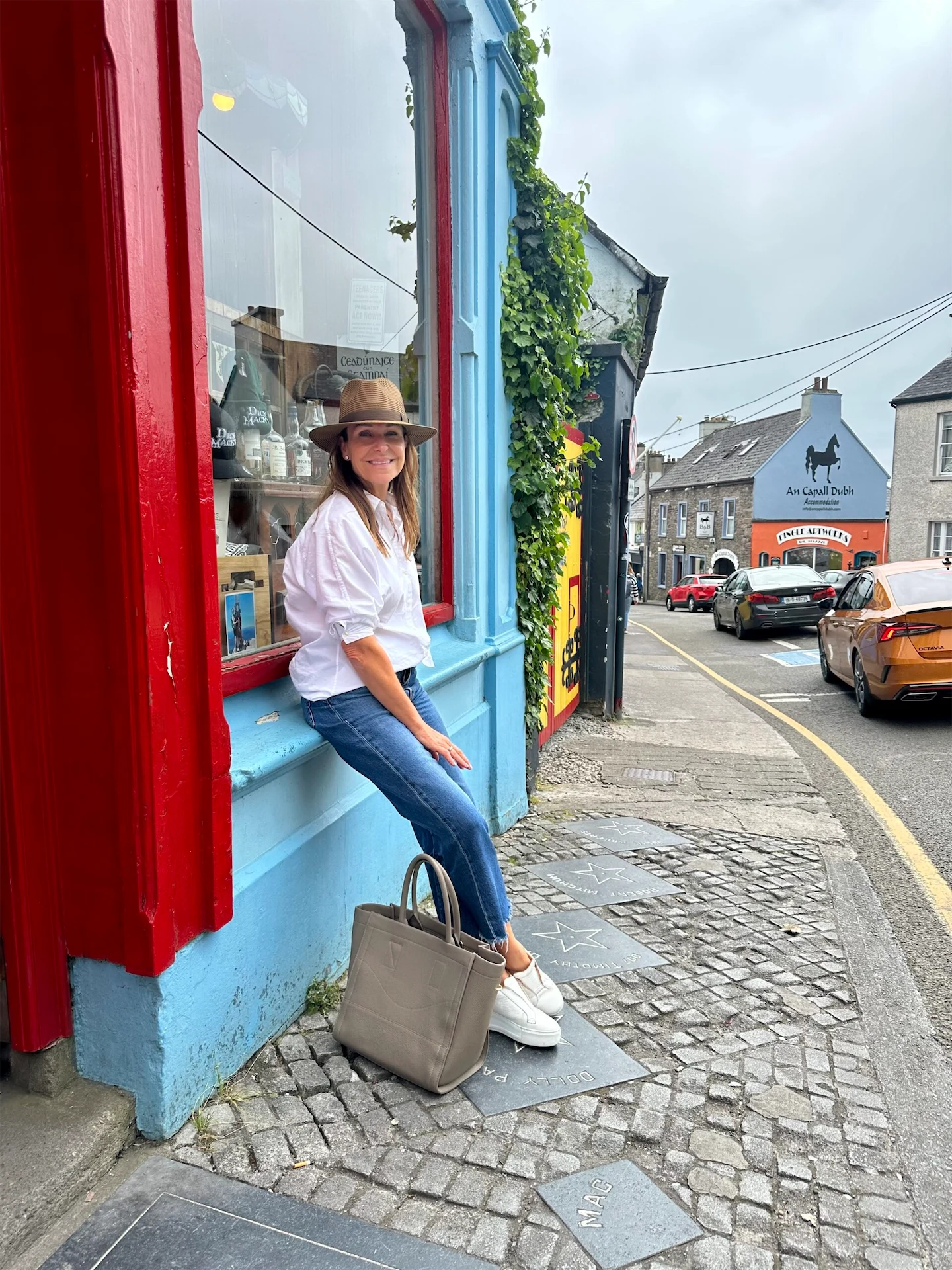Today I am on a short trip to Dingle to visit some relatives. My jeans are Levi’s Ribcage from Kildare Village. They are super soft and comfortable. My shirt is from COS and once again I’m in my Russell and Bromley platform trainers. The bag I have with me today is by Landa. I take this bag everywhere with me, it carries a multitude. I love the softness of the leather. It has another crossbody bag inside it which is so handy for me when I’m looking to carry less. The hat I picked up in a shop in Dingle to shade me from the sun. I love this casual look. There’s nothing comparable to the classic blue jeans and white shirt combo, it’s a timeless look, so easy to wear. Perfect for my weekend trip.