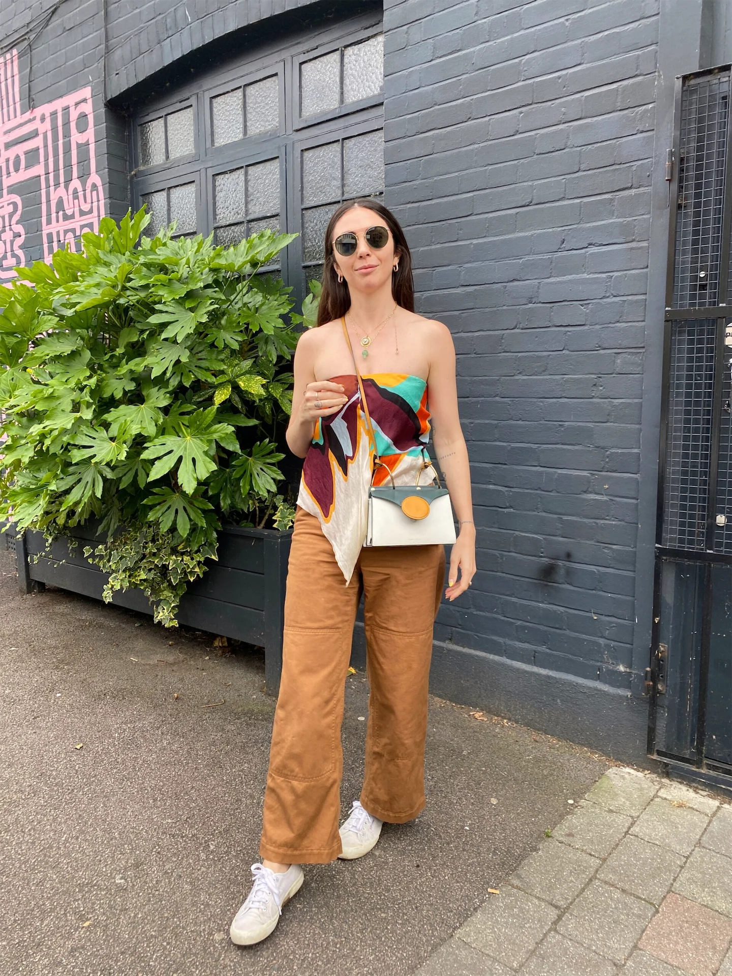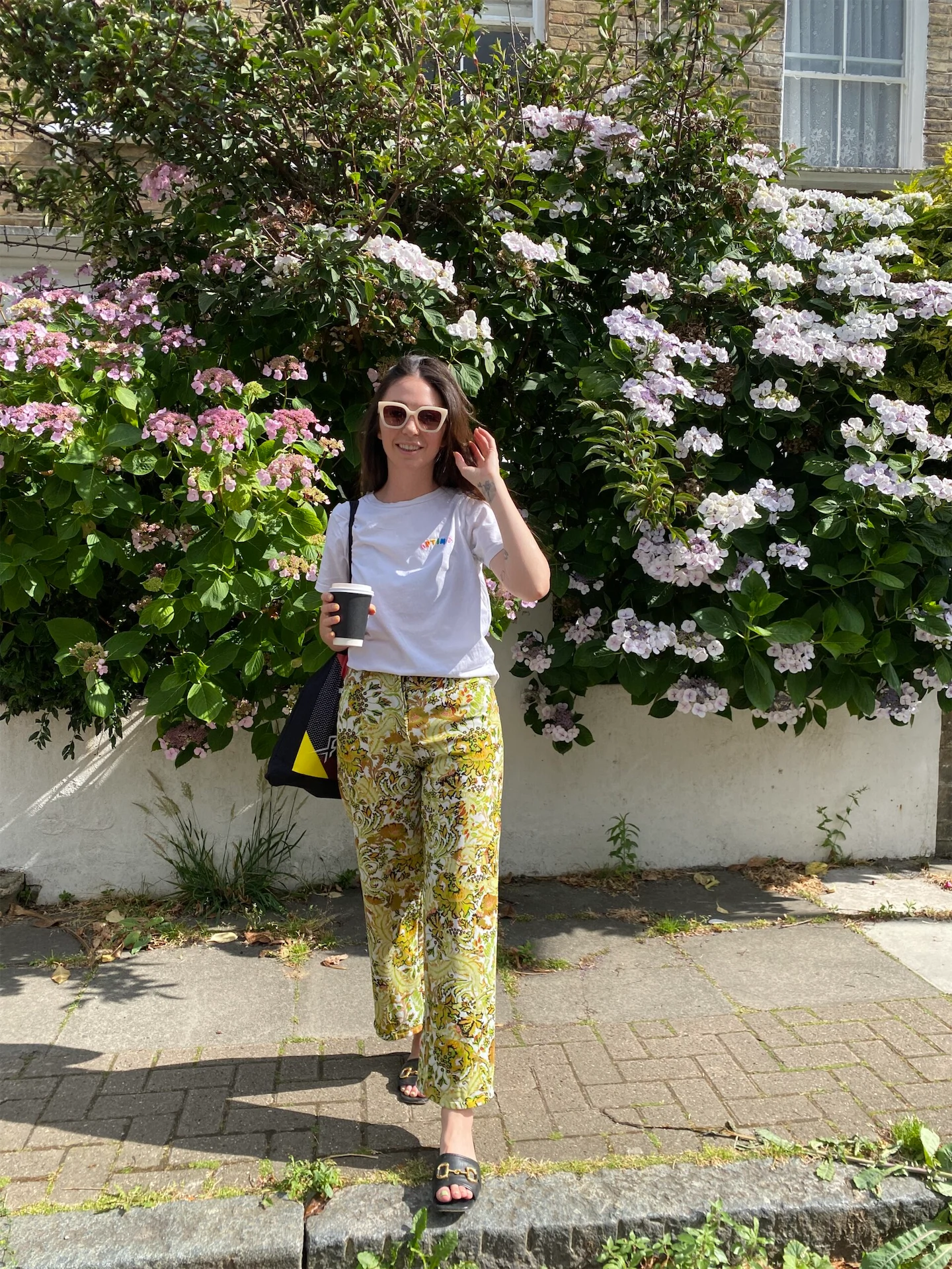 Today is a studio day so I’m keeping it quite comfortable. There’s an event on in a few days and there will be deliveries today. These trousers, which are from Dries Van Noten – I got them on sale from Net-A-Porter earlier this year – have a bit of elastane in them so while I think they’re semi-smart, I can also bend down to pick up parcels and boxes! I paired it with the ‘Optimist’ t-shirt from Birdsong and Gucci slides. Sunnies are from Jimmy Fairly – they’ve been around a while but I’ve only recently discovered them and I think they have such fun frames. My bag is a tote… I genuinely think I have over 30 totes! This one is from the barre studio, Frame, which is a lovely class studio if you ever visit London!