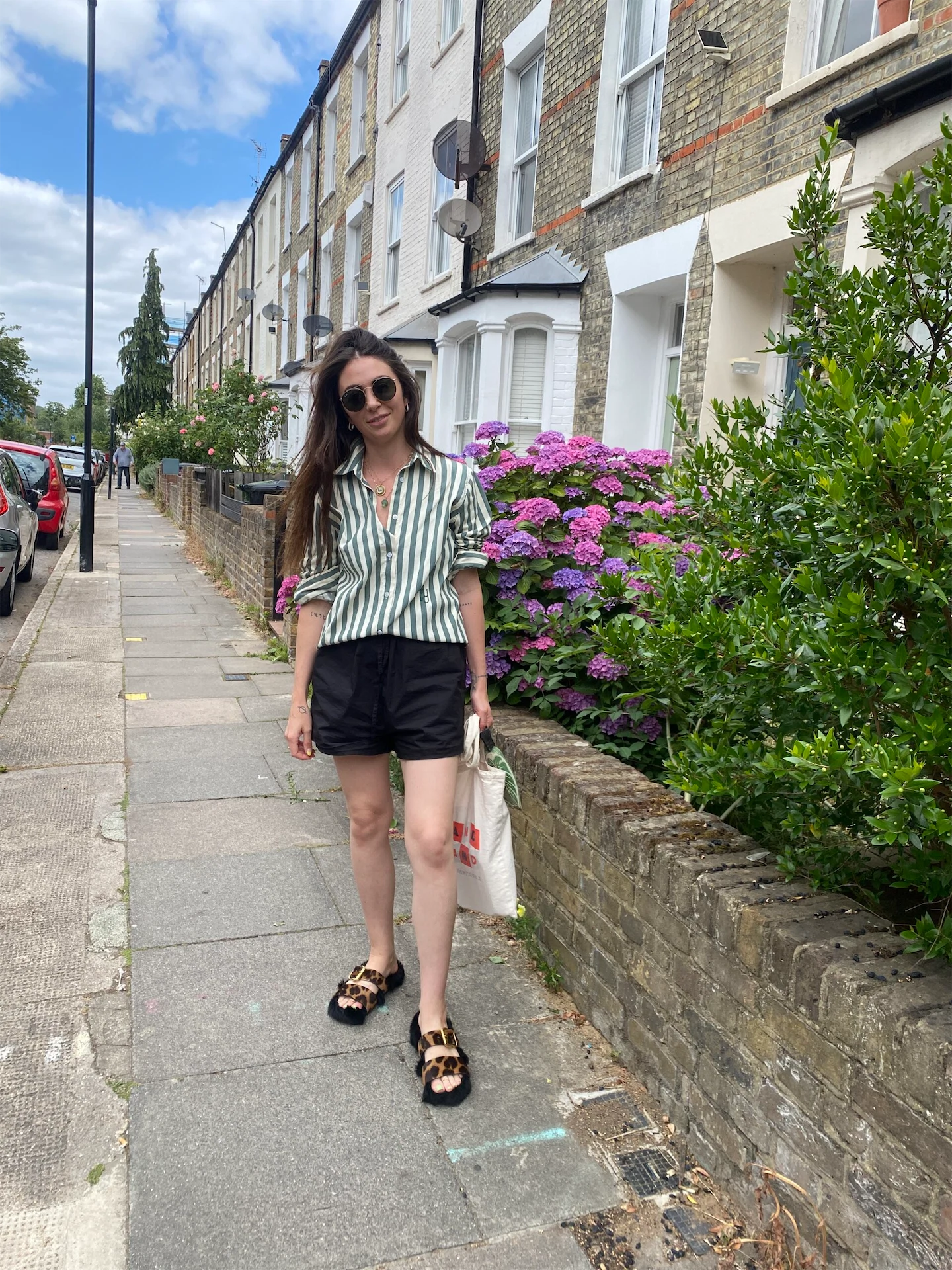 I’m going to the local Farmer’s market and then a brewery today. Wearing pyjama shorts from the same brand Deji Studios, they use organic cotton and because they’re designed to be pyjamas they are just very loose and comfortable… I think I’m getting away with wearing pyjamas in public! The shirt is Yaitte and my bag is one of my 30 totes. I know they’re ugly but I really love these furry Prada sandals! A friend actually messaged me when I posted about these and said she hoped they had been discontinued!