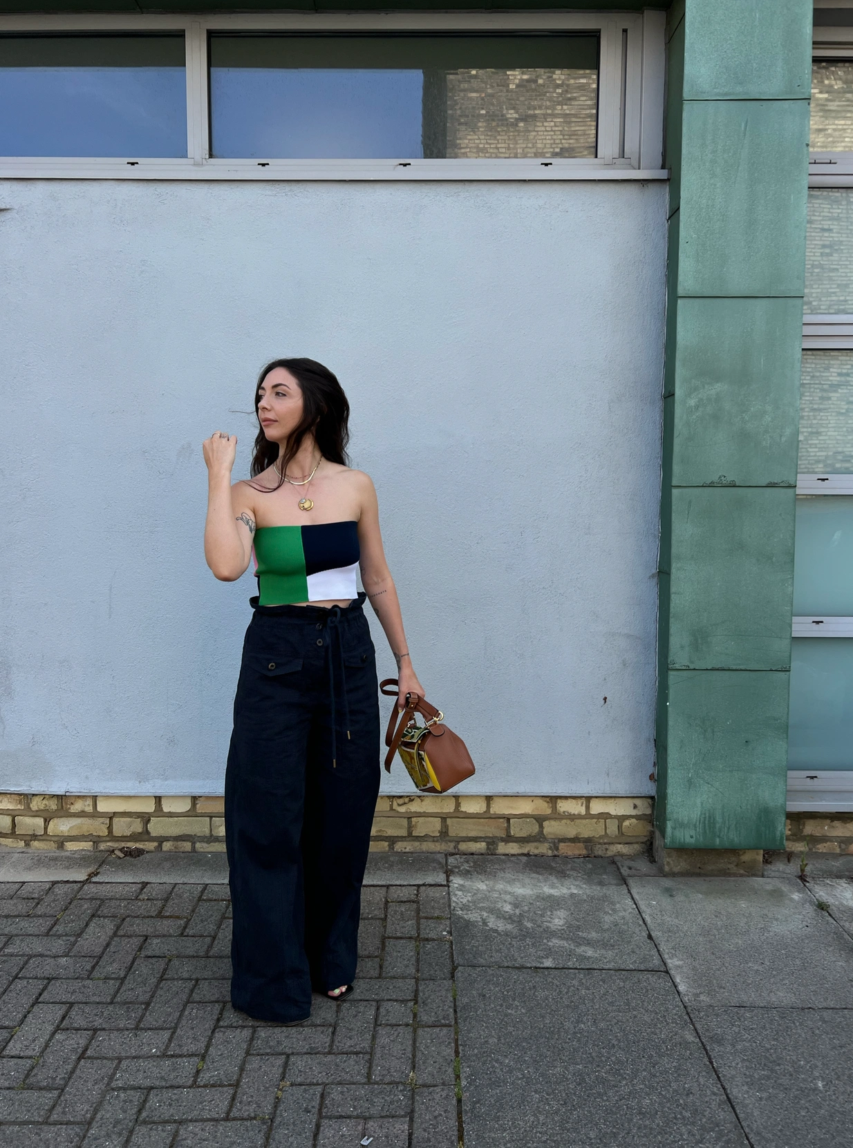 Bit of a running around town today before an event day and some site visits in between. I’m wearing this Tibi bandeau top, a find from Vestiaire Collective from about three years ago. I love a high-waisted trouser and these navy ones are from Ulla Johnson. My Loewe bag is their collaboration with William De Morgan and Gucci slides. I always get asked where my necklaces are from – these ones are from Orelia, Alighieri and Sandra Alexandra, who I think do some of the coolest chunky necklaces.