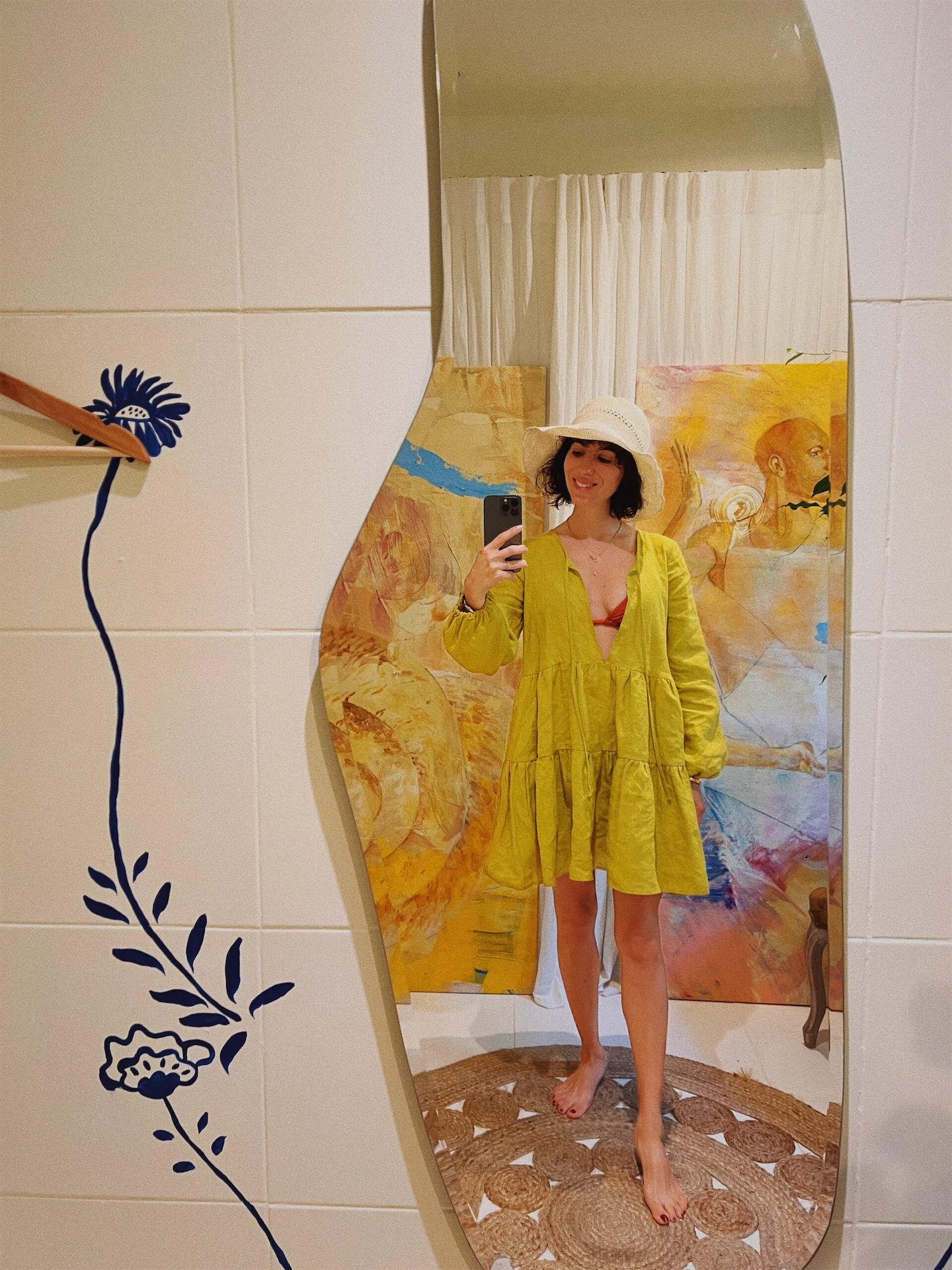 When I’m in Uruguay, I love to integrate moments of leisure into my working day. Here I am getting dressed for lunch by the pool in my summer house, wearing our Greta top in Moss, for a little poolside splash of colour. When I get the time, I love to saunter down to one of my favourite shops in Punte del Este – a secret, nameless and magical destination for antique lovers – located a couple of blocks away from a petrol station in the direction of the woods.