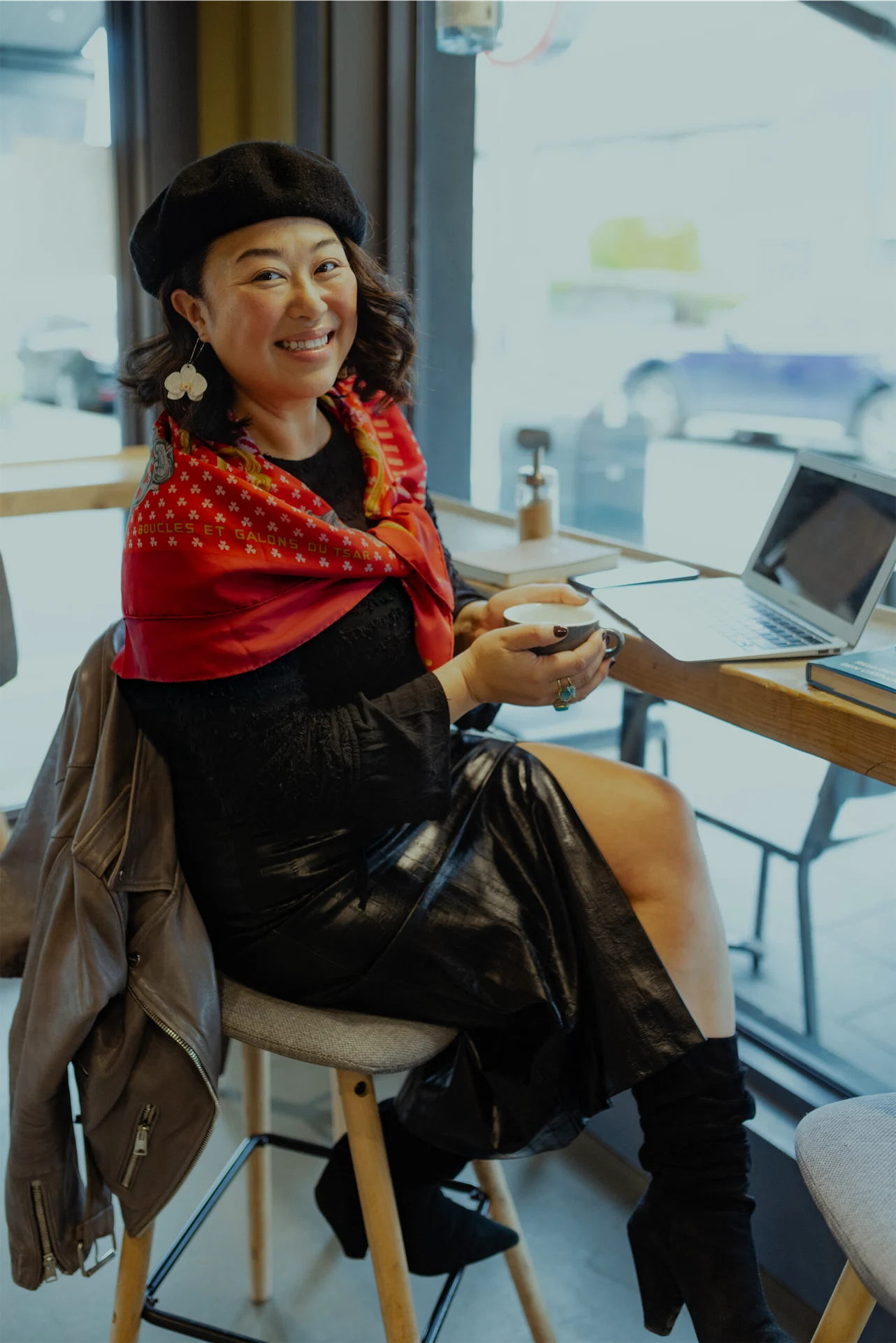 Looks worn by me have to have an energy about them. I love to buy vintage and I’m inspired by the likes of Nicole Richie and Beyoncé and Elton John. Before I put anything on, I check my energy and who my clients are, and what my agenda is for the day. Today, I have a life-coaching one-to-one session with a client. I also have admin and invoicing to catch up on. I LOVE French-inspired simplicity in makeup, hair and styling. I feel more feminine and chic when I wear my Rotate Birger Christensen Faux leather pencil skirt in this amazing croc print. As a curvy human, I love fitted and snug pieces that fit my shape – this skirt is the best. I also wore my Zara wrap black shirt with bell sleeve details and of course, my Hermès scarf, a 40th birthday gift from my friends. It has little shamrock detailing on it and is a gorgeous silk scarf with a red pop of colour. I love a beret too, it helps to keep that hair framed! My suede slouchy black boots are from Kurt Geiger and the Orchid drop earrings are another pair from Duil Ireland to keep my whole look fresh and modern.
