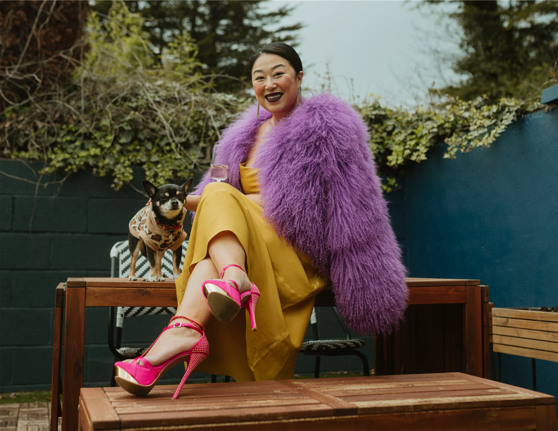 I’m excited today! There is a family wedding to go to and I am doing everyone’s makeup and also attending the wedding. This often happens, but I am an organised freak! EVERYONE who knows me in the industry, knows that I need to know my timings for the day and to help myself, I visualise the flow of the day. I am wearing a beautiful Zara amber gold fitted dress with ruching on one side of the dress to flatter my tummy. It is asymmetrical on the bottom part of the dress. The perfect pre-loved purple Mongolian fur jacket finishes the look. I have sewn in small snaps to lift up the corner of the jacket to help with the proportions of my body. This particular fur can be overwhelming so shortening the jacket helps me show off my body length but also makes the piece look more expensively tailored. I am short, so a pair of hot pink platform-heeled sandals that are over 12 years old (gifted to me by my friend Sarah Killen) are a must. These are very well-loved platforms – they’re so comfortable and easy to walk in despite the height. I pulled my hair back and am wearing my 40th birthday gift to myself – earrings with turquoise fringing, they definitely have an art deco vibe to them. I bought them in The Collective on Drury Street. Designer Christina Goldston is so beautiful and her jewellery aesthetic is so luxurious.