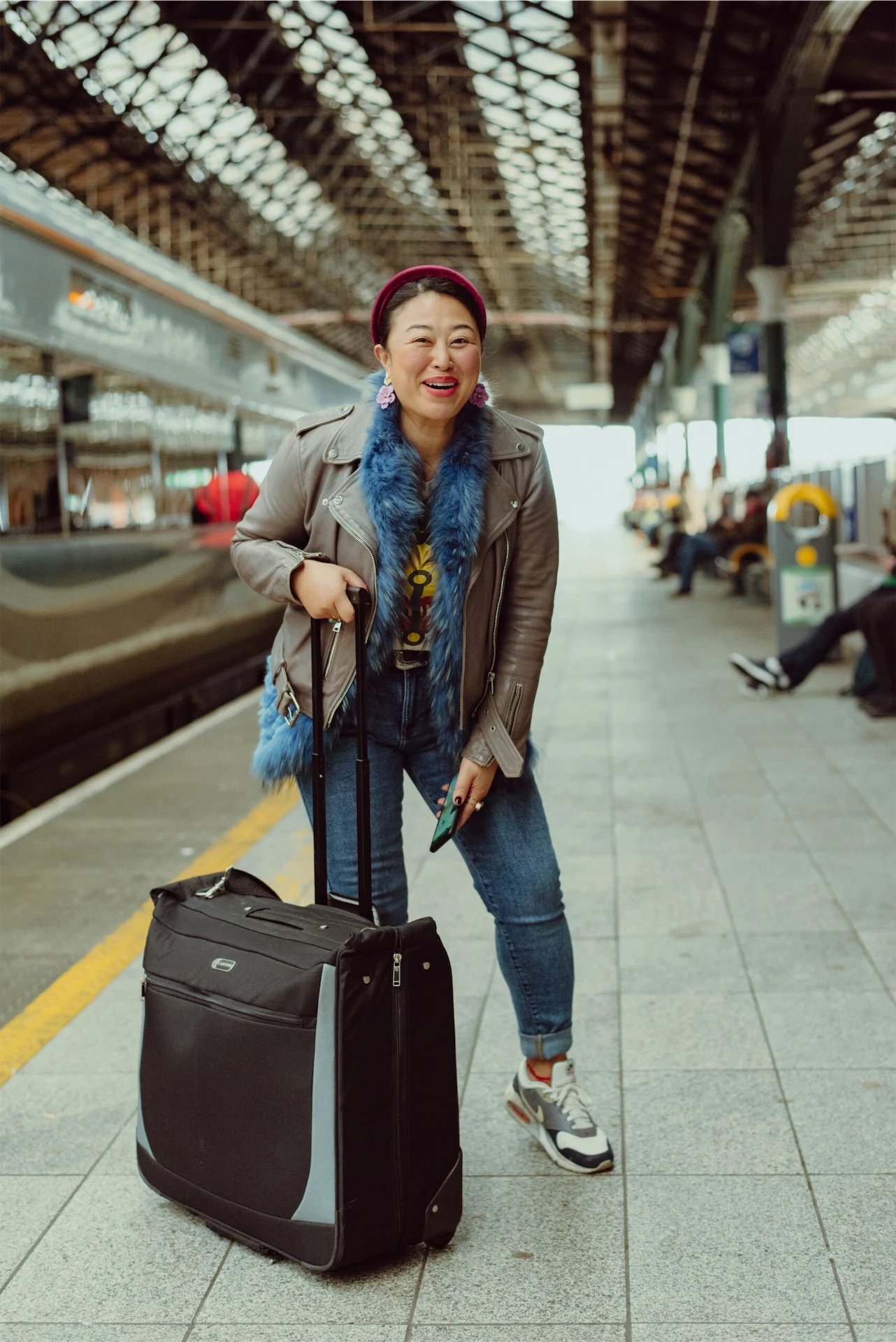 I am usually on the go a lot, and today is no exception. I’m heading to the train station to do a shoot. When I am choosing my outfit for work, I am always practical, fun and quirky when styling myself. I accessorise a lot, especially with earrings – which you will see this week! Earrings are my power suit accessory and I get such good energy buying from Irish jewellery designers. Today I am wearing vintage Nikes that I bought in Berlin. I love vintage and finding sustainable ways to repurpose fashion, and I love pieces that last the test of time too. My grey leather jacket from All Saints is a staple jacket that goes well with all my outfits. My jeans are from Zara – the stretch fabric is made for comfort and movement. I love pieces to fit me when I go from a size 12 to a size 14 and then yo-yo back to a size 12. Size isn’t important to me… styling is! I layered the blue gilet from Arabella Girl’s pop-up shop in Sandymount with my Alexander McQueen vintage t-shirt, bought in BT like 20 years ago! Duil Ireland earrings are light and fun and durable.