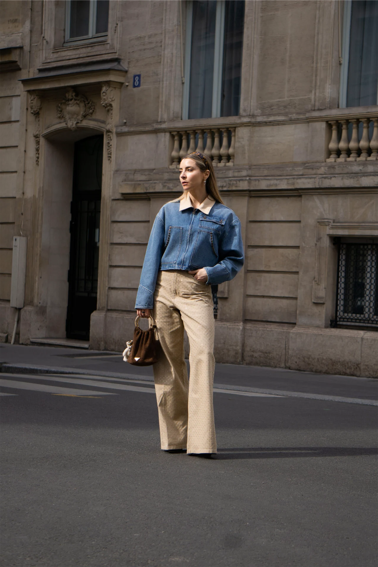Friday called for a very springy set from Sandro, a brand that I’ve been wearing for many years and that I keep wanting more from, for its amazing quality and stunning fit. I paired this cropped denim jacket with ton-sur-ton studded jeans, which glistened under the Parisian sun. The final touch was my mini Prada bucket bag in suede along with the cutest teddy charm.