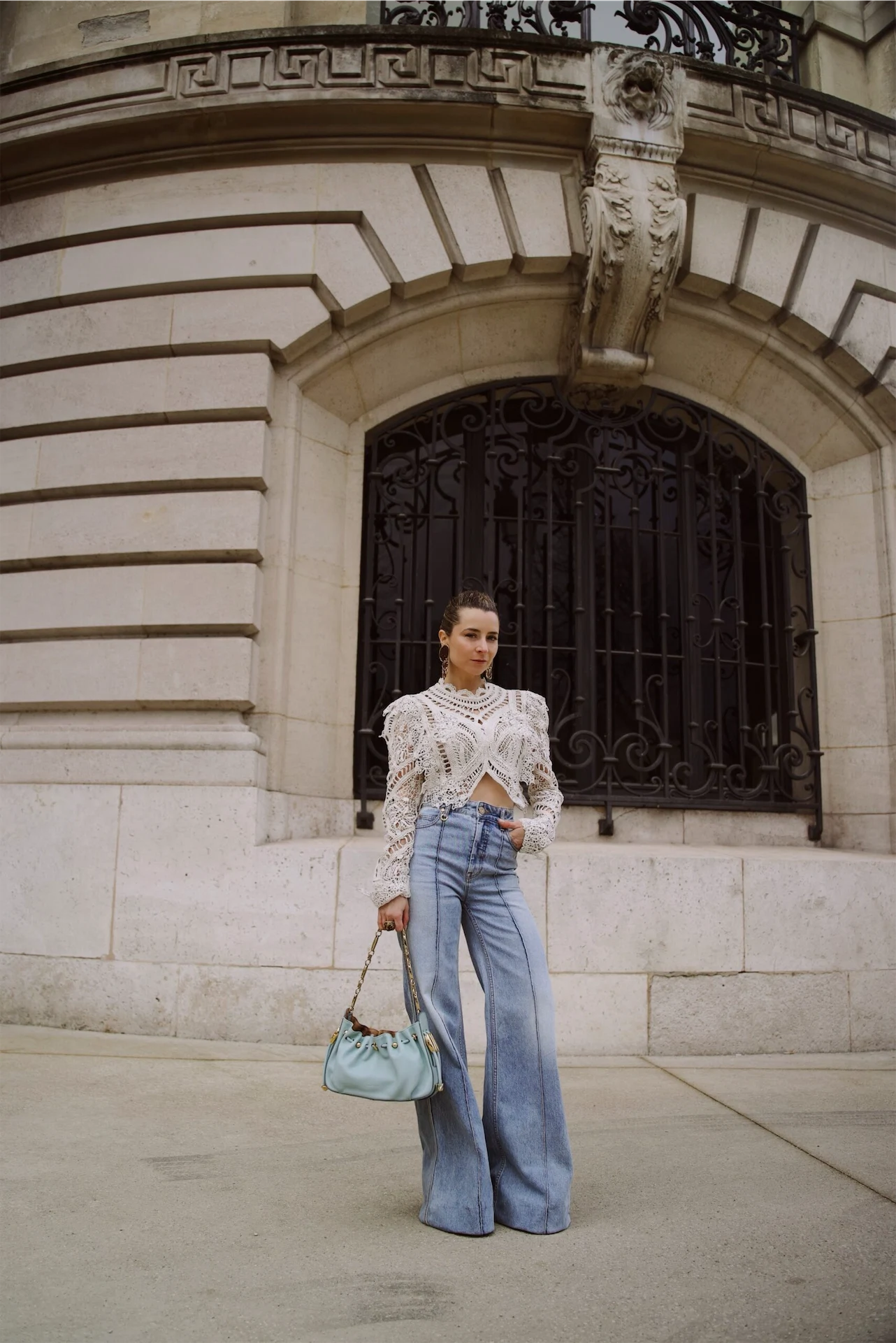 Finally time for Zimmermann, always a highlight for me! This incredible ensemble had to wait until the last day of Paris Fashion Week to have its well-deserved moment. Boho-chic is back, as is seen with this crochet top paired beautifully with the on-trend wide-leg denim. The gorgeous shoulder bag with gold hardware tied it all together – a true Zimmermann dream.