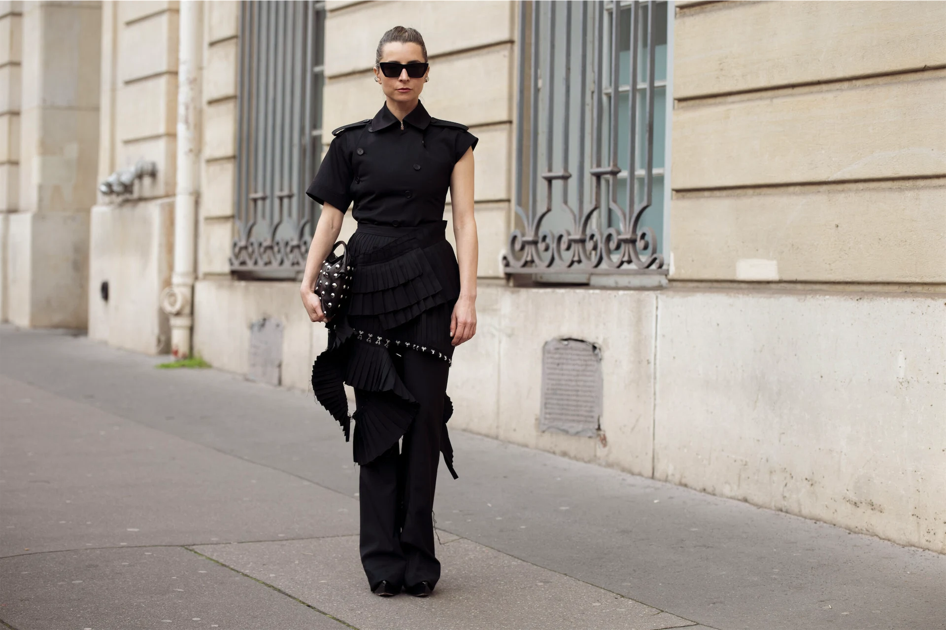 Rokh is one of my absolute favourite brands, as I appreciate the creative process of garment deconstruction, celebrating “artisanal imperfection” behind each look. I was honoured to wear a total look to their show: a powerful black ensemble, featuring a collared asymmetric shirt with a pair of trousers and a ruffled over-skirt. Definitely one of the most interesting looks I’ve worn to date, that went perfectly with a studded Freda Salvadore clutch.