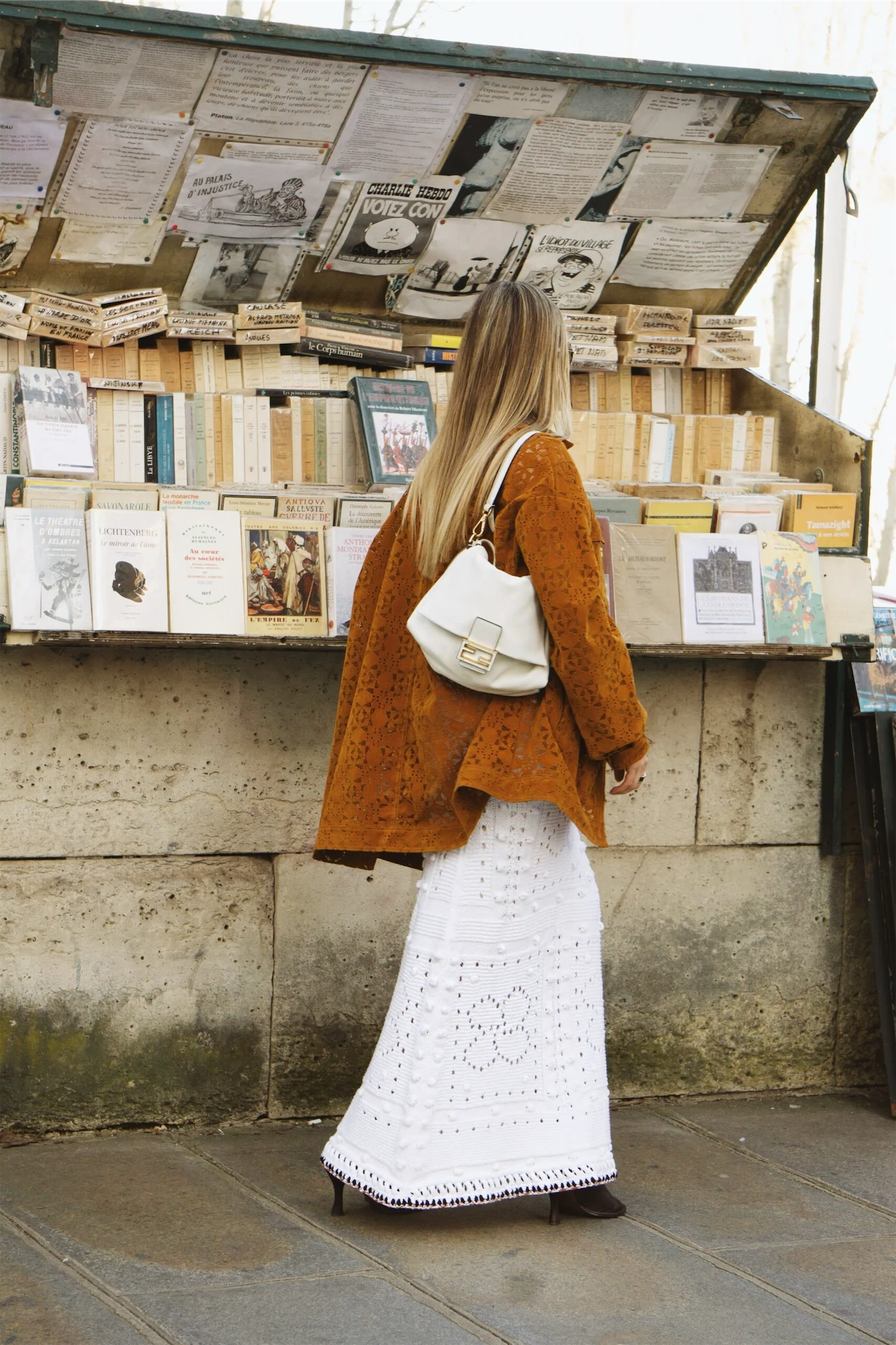 Another day, another look. This time, I couldn’t wait to take out the newest Fendi Mamma Baguette in the most luxurious white leather, which paired perfectly with a crochet skirt by Dorothee Schumacher and an oversized caramel suede jacket by Source Unknown. I kept the rest of the accessories simple, adding a touch of seventies glam with Barton Perreira sunglasses.