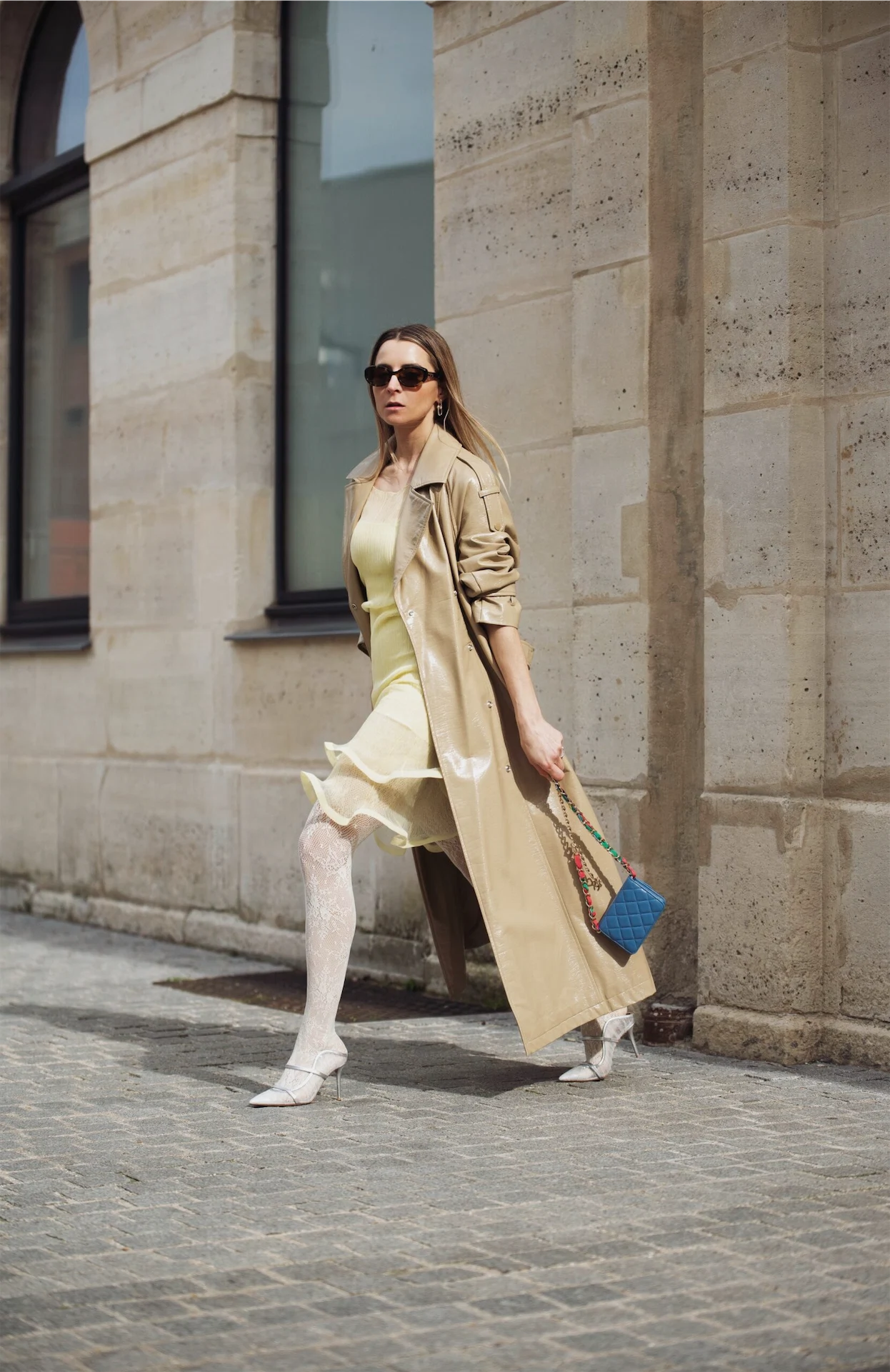 Even though I left the city a decade ago, Paris always feels like home. Everything seems easy and effortless, but don’t get me wrong, fashion week is never a vacation! My week started with the most incredible Magda Butrym show, who truly never fails, season after season, and I just want everything! I chose a Simkhai dress, in this season’s most loved shade of buttercup yellow, and paired it with white lace tights by Swedish Stockings, the trench coat of my dreams in faux patent leather by Netherlandian brand Dante6, and a Chanel mini bag for a contrasting pop of colour.