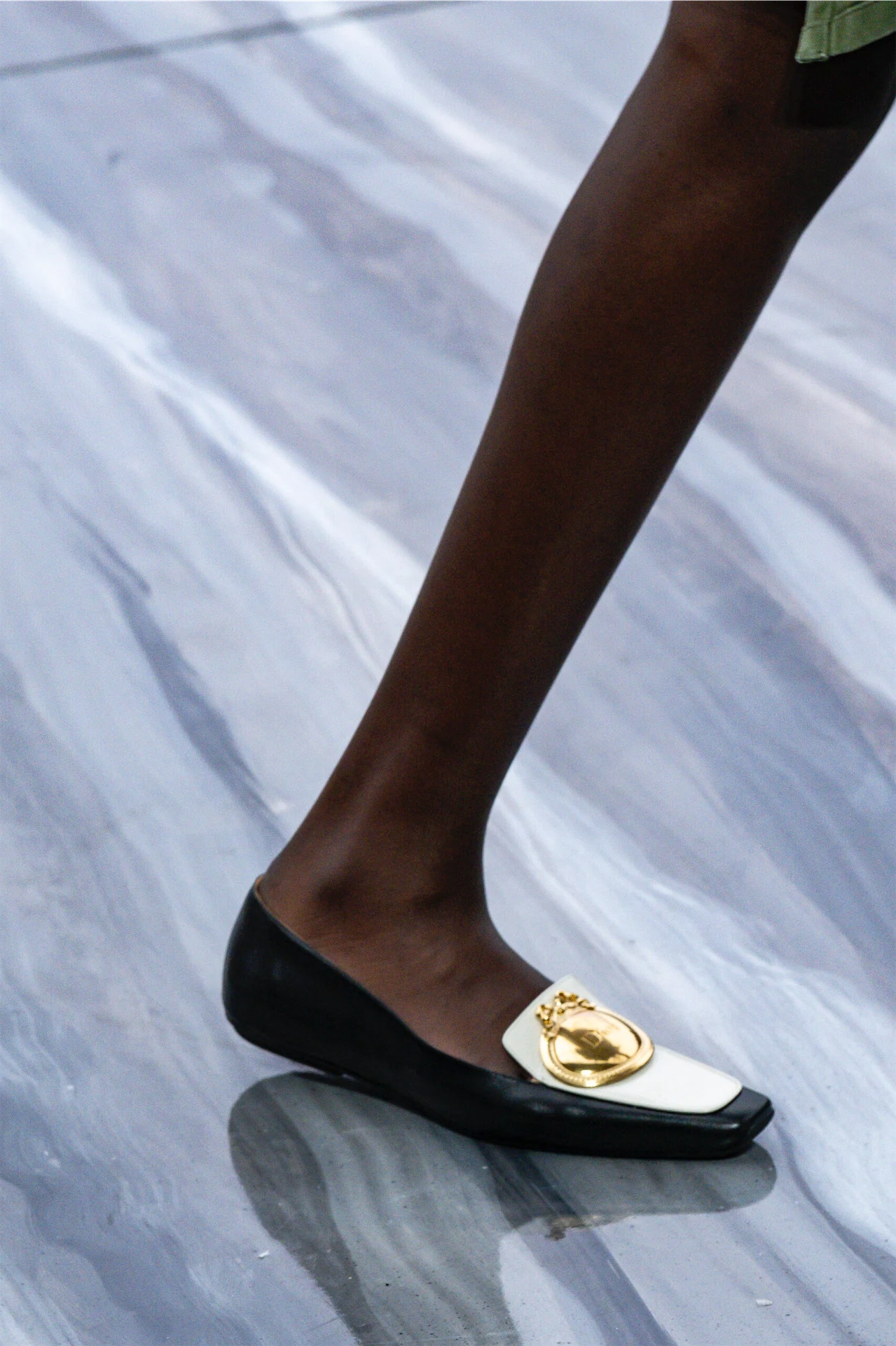 For a more grounded, and highly wearable touch, Anderson offered two-toned, gilded loafers and pointed, blunt flats with C and D on either foot.