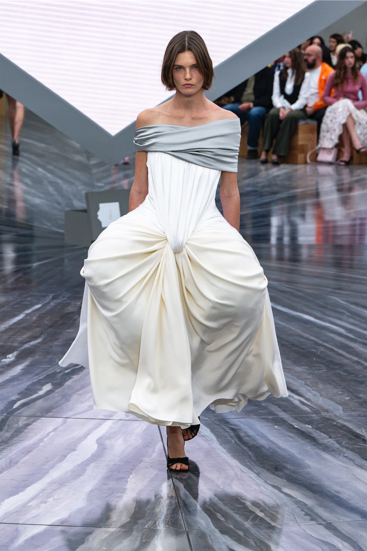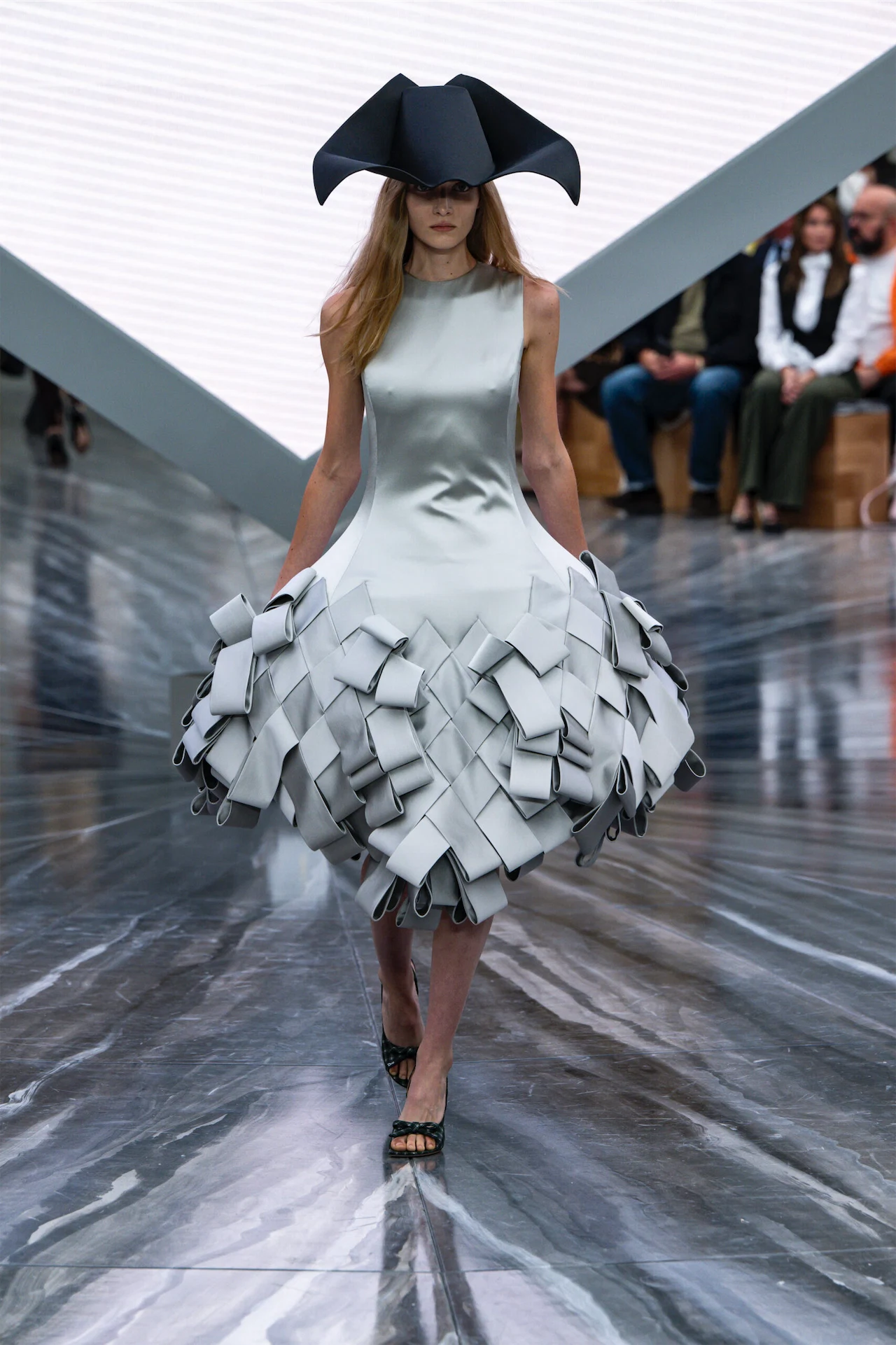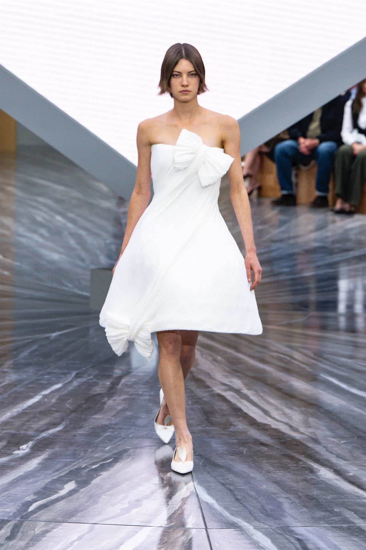 Anderson doesn’t do straightforward pretty. Even with the romantic-coded dresses, there was subtle tension – whether it was the pleating pulled taut across the model’s shoulders, the bustle-shaped volumes in skirts, or the cut-outs in shimmering sequin dresses.