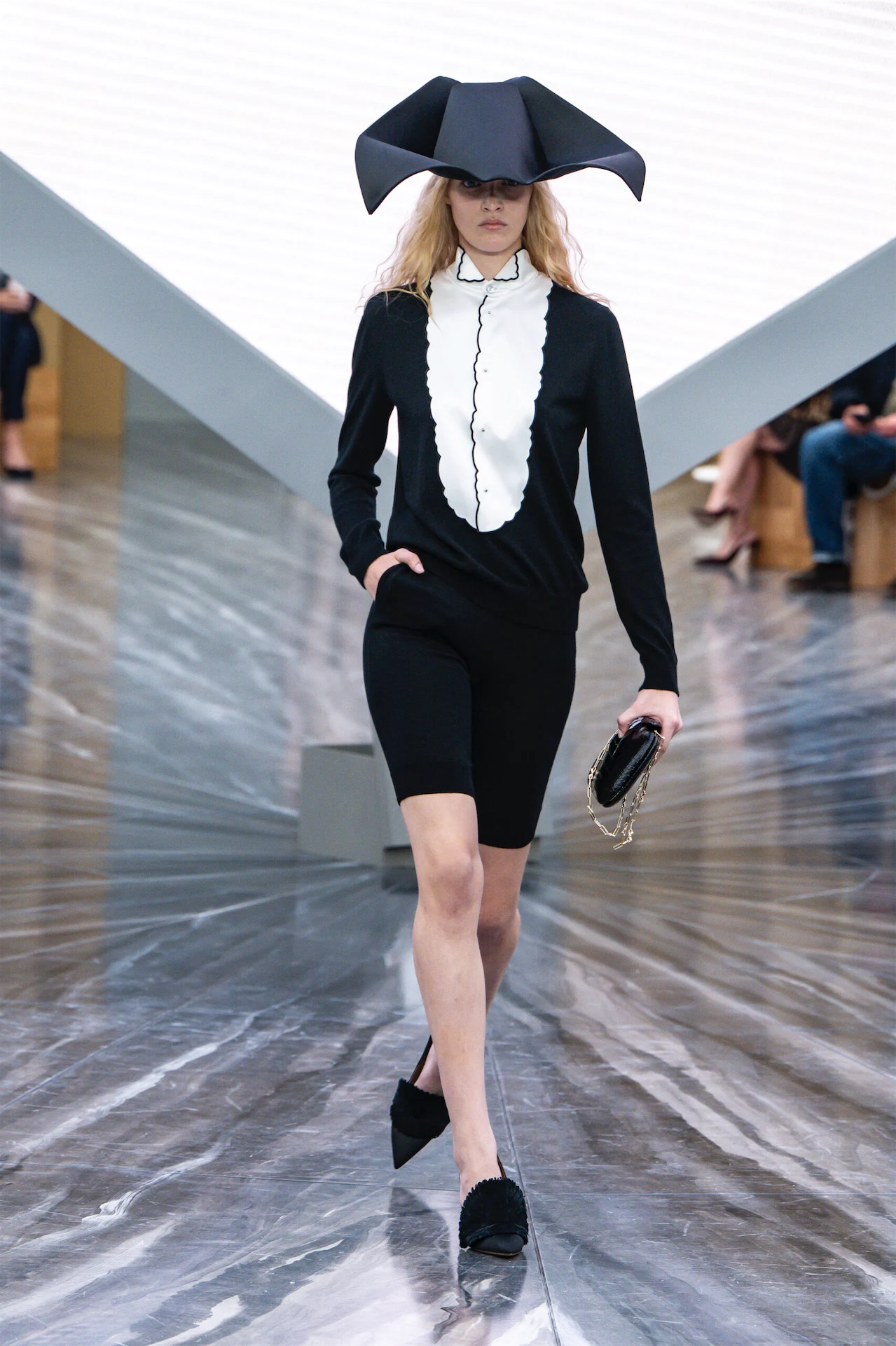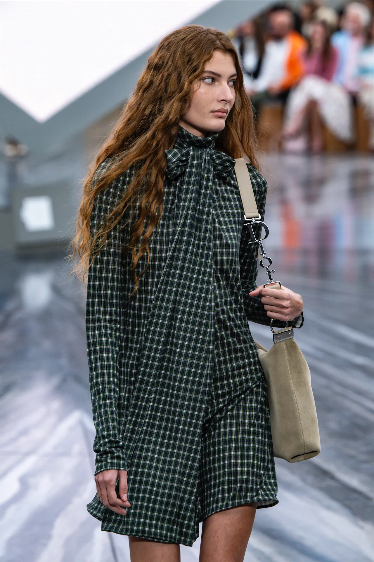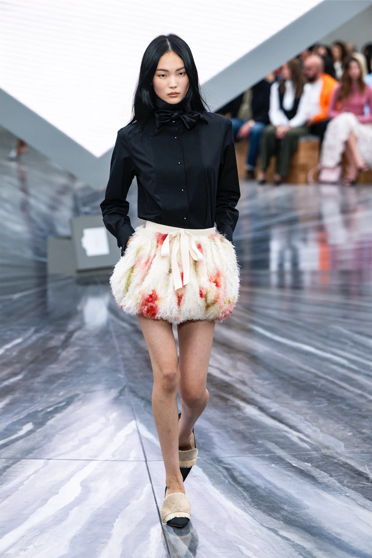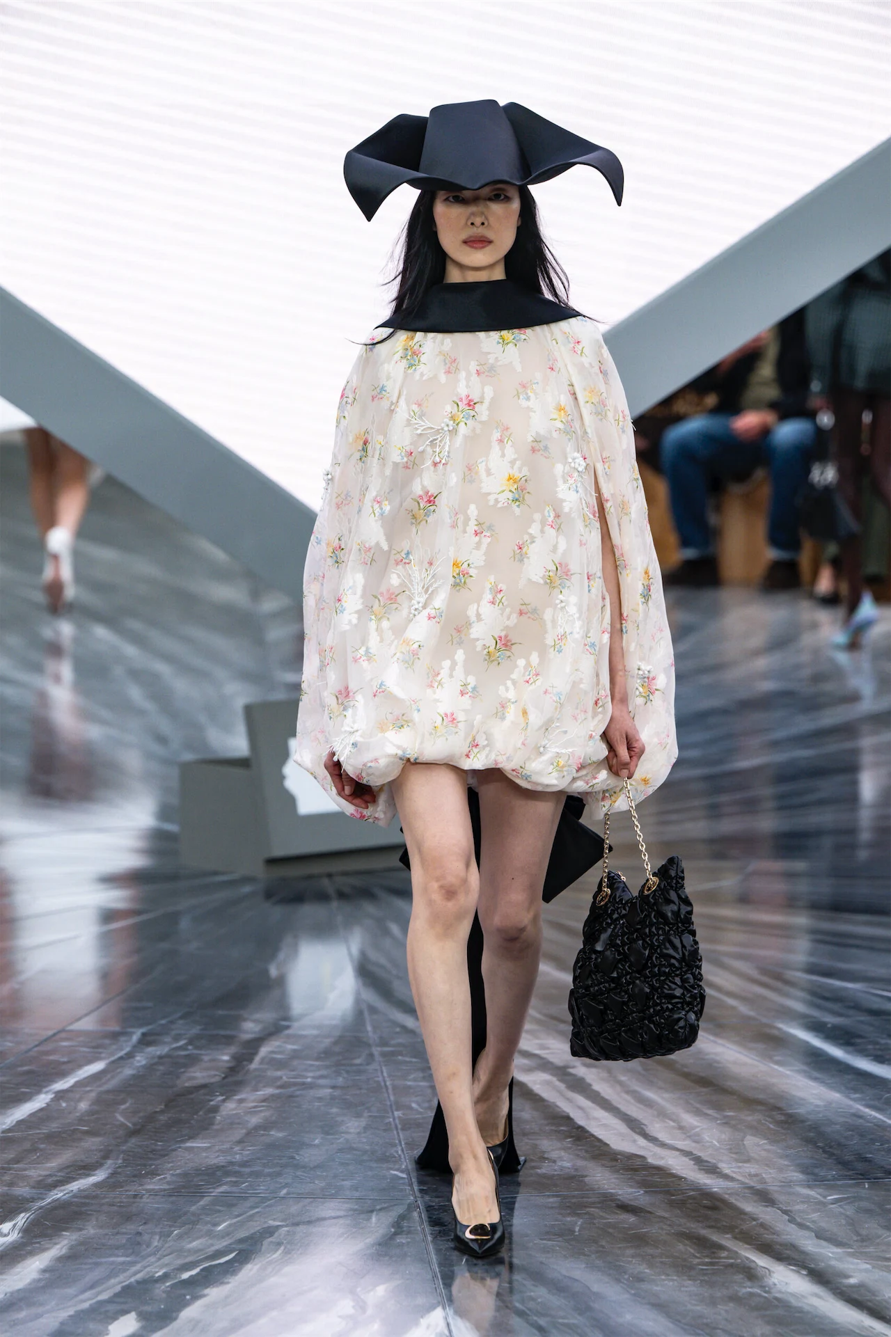 Footwear was equally swoon-worthy. Slipper-style mules and heels were adorned with Rosettes, checks, and bows. Sparkly kitten heels adorned with rabbit ears were paired with ruched, voluminous dresses, perfectly blending fantasy and wearability.