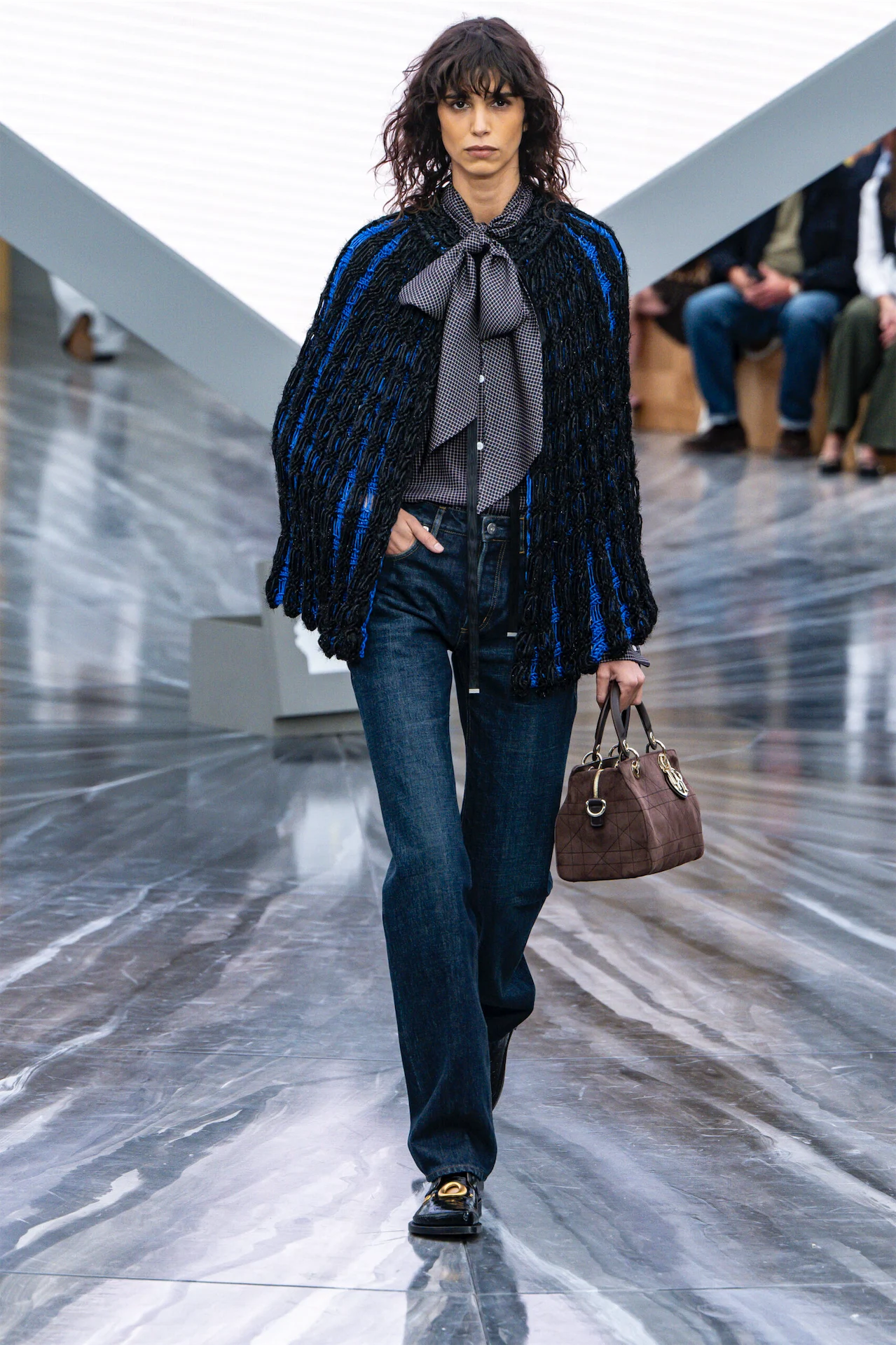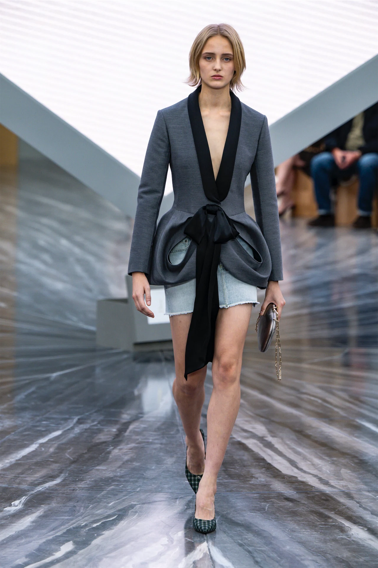 This tension between heritage and subversion also echoed throughout the show. The Dior codes that have become signatures of the French fashion house were reinvented and revisited under Anderson’s lens. The bar jacket, a defining Dior silhouette, came in many guises, most notably shrunken sculptural skirt suits decked out in Donegal tweed. Elsewhere, they came with cut-outs and were tied up with bows.