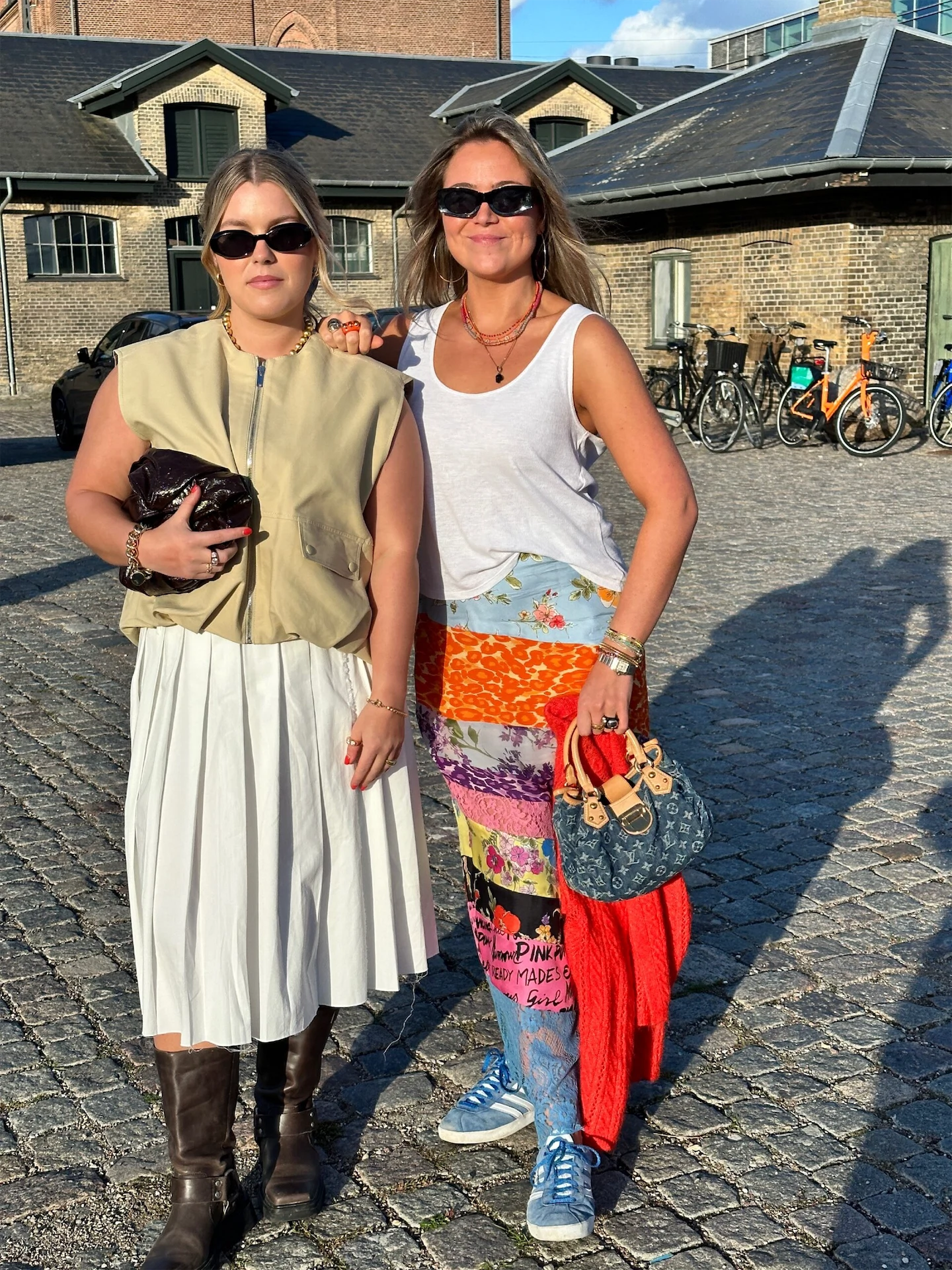 Spotted some Irish queens! They were really representing this year. I adore Gabrielle Luksaite in this chic farm girl look. It’s a perfect example of a transitional outfit – it’s definitely giving autumnal vibes with the ‘it girl’ biker boots and patent brown bag, but the sleeveless waistcoat and cream linen skirt really lighten the look and bring it back to summer. She added some cool from her own jewellery label, by stacking her ‘CRYSTAL’ rings and letting her chunky ‘GOLD GIA’ necklace peep out at the top of her waistcoat. Claudia Lamour styled her Mum’s vintage Moschino skirt and vintage Louis Vuitton denim bag with an easy white tank and blue Gazelles. We love a sustainable queen! She really made these vintage pieces her own. I love the mix of colours and prints that perfectly complement her accessories. It’s such a cool, casual, effortless look – she has really tapped into the Copenhagen cool way of dressing… it’s as if she has been living there all her life!