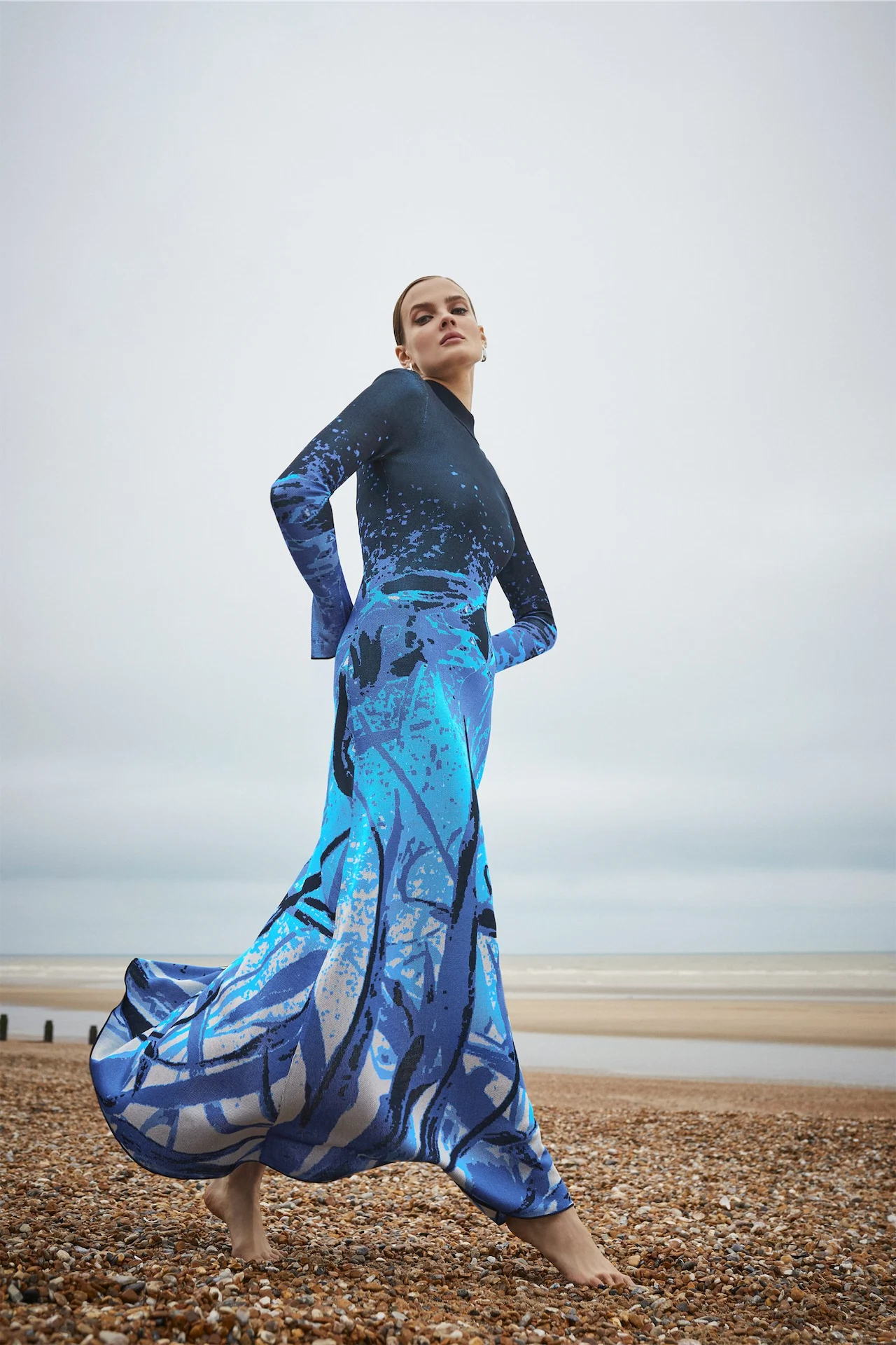 This woven dress is particularly inspired by Nicholas Hughes’ ‘Natural Chaos’ artwork. In true day-to-evening style, this bold design showcases an eye-catching print and a slinky jacquard design beautifully woven together. Cut in a high neck with a chic back cut-out, this style has both versatility and longevity in any repertoire.