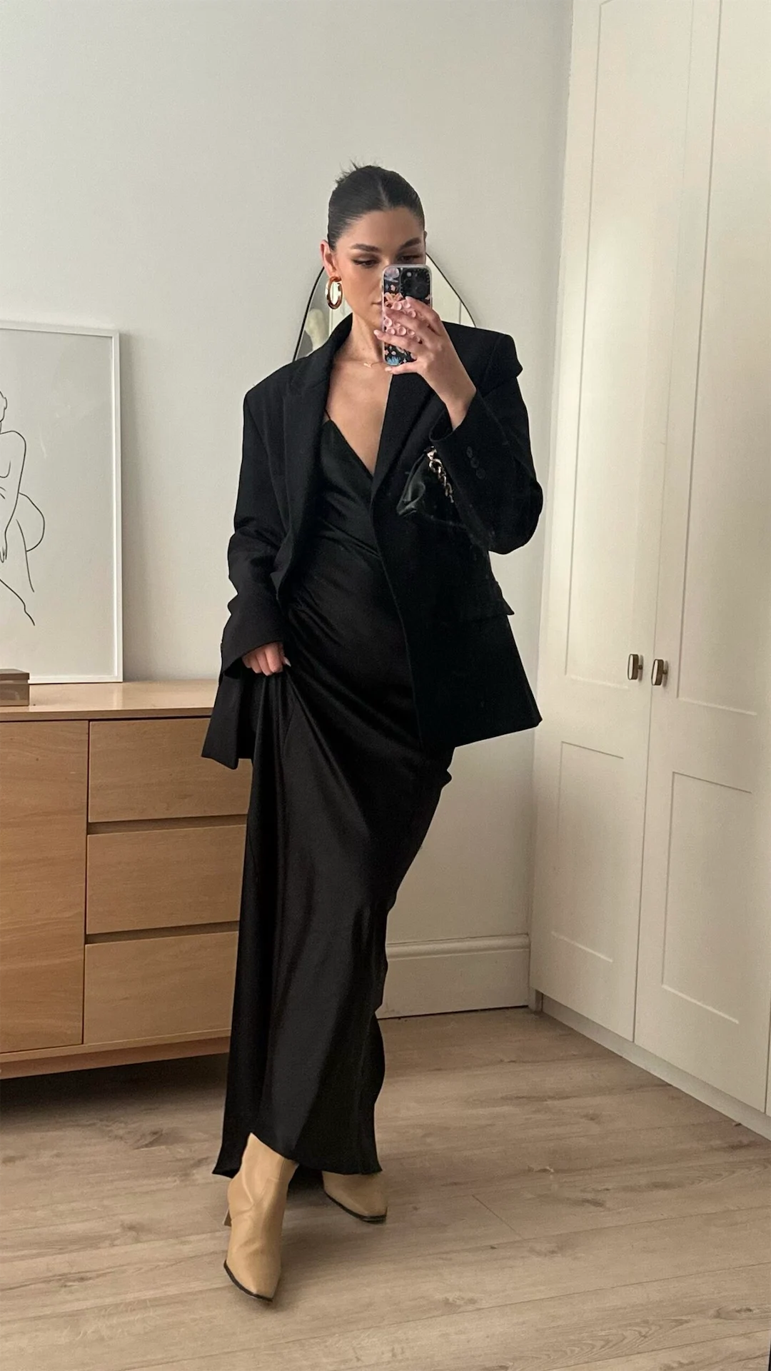 Tonight we went for some cocktails and dinner so I opted for this classic black satin maxi dress topped with a structured blazer and some boots. I love simple, monochrome looks that I can wear again and again. I’ve worn this dress so many different ways – topped with jumpers, over tees or shirts – and it’s so versatile.