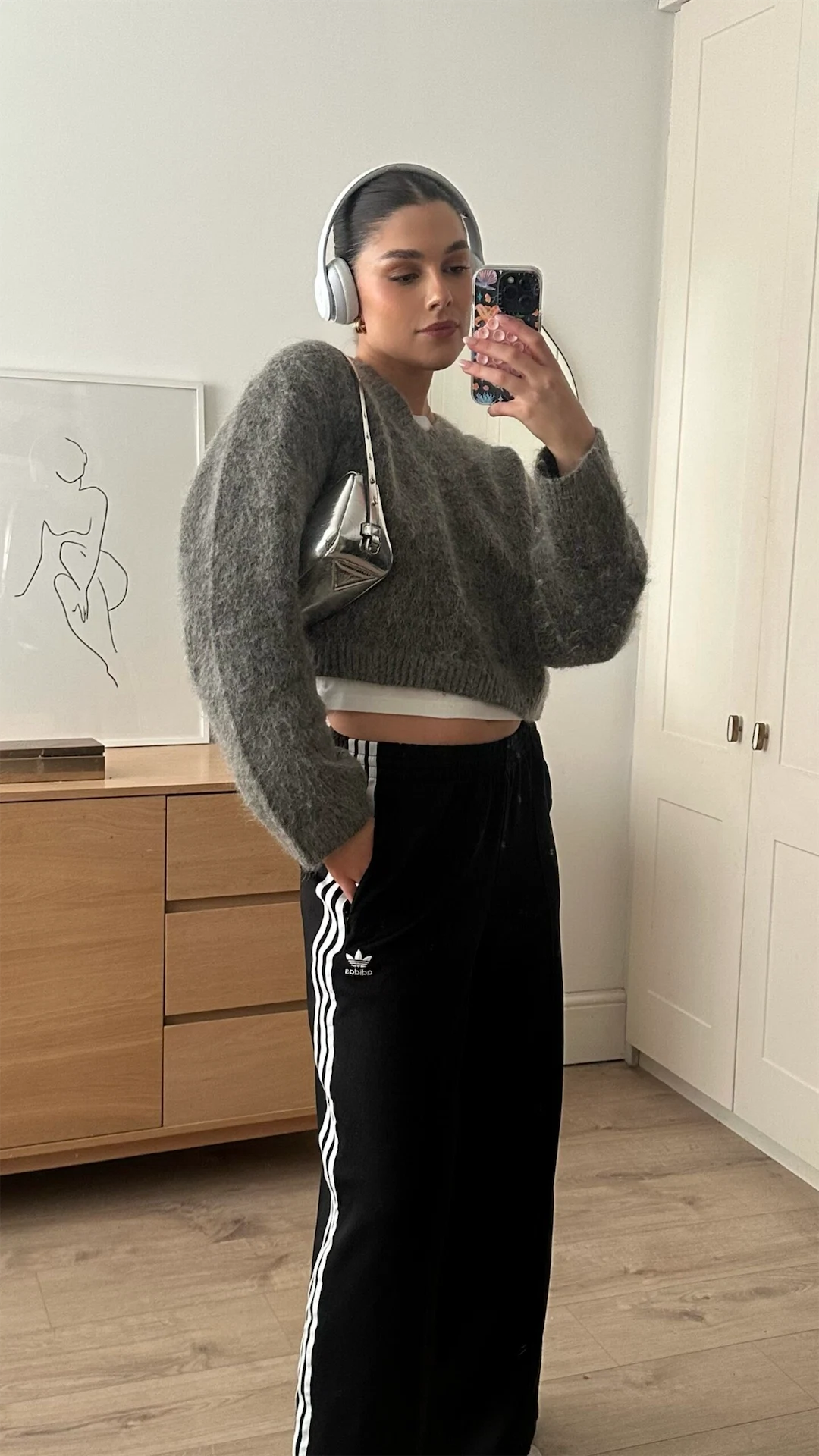 As for most people, Sunday is a reset day for me so I spent it in these comfy adidas track pants and a warm wool jumper layered over a simple white tee. I added this cute silver bag for fun. We grabbed a coffee with Louie and went for a walk before cuddling up on the sofa for a Sesame Street marathon (for the hundredth time!). As if these adidas wide legs aren’t cosy enough, I was in my pyjamas by 3pm ready for my Sunday roast.