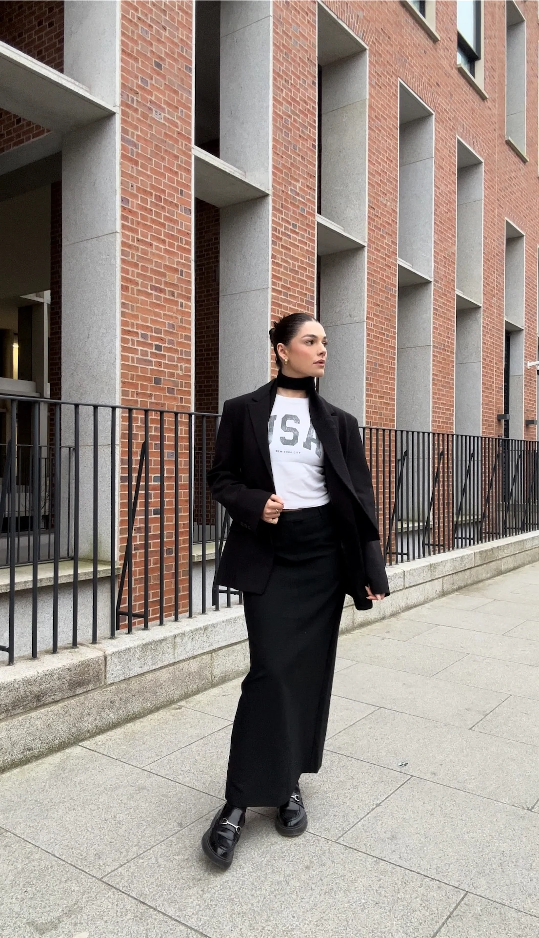 I was back in town today for a meeting. I wanted something that looked put together but comfy so I went back to my trusty black maxi skirt, this time pairing it with a T-shirt and blazer. I love pairing classic, tailored shapes with more casual pieces! These loafers are so comfy, I can stomp around in them all day and I like how they change the look of the skirt that I’ve already worn this week. I am obsessed with skinny scarfs at the moment, I have to stop myself from putting them with every outfit but today was a skinny scarf day.
