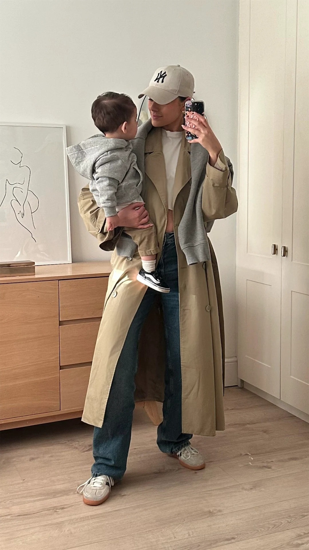 I started my day early filming in Virgin Media and then I was back in full Mommy mode so comfort is key today. I’m wearing a classic jeans and T-shirt look for ultimate ease. I’m obsessed with this Hanna Schönberg x NA-KD trench. I got it a few seasons ago, it’s super long and oversized and makes any simple outfit look so much cooler. I added a cap to distract from my very tired-looking eyes after a sleepless night with Louie and an early start. Louie is wearing an oversized hoodie, some straight-leg trousers and his classic Vans.