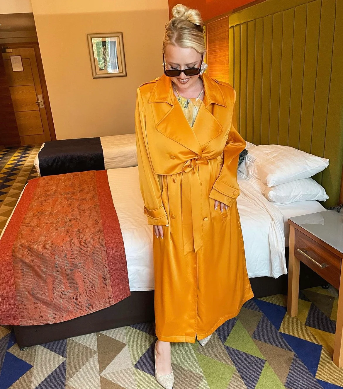 I wore this outfit to a wedding last weekend. My satin look mustard trench is from the Megan Fox x Boohoo range. My dress is Zara, I bought it on a Roman holiday earlier this year. I found my sparkly Carvela heels in my local NCBI charity shop and my pearl earrings are my best vintage find from Jenny Vander vintage.