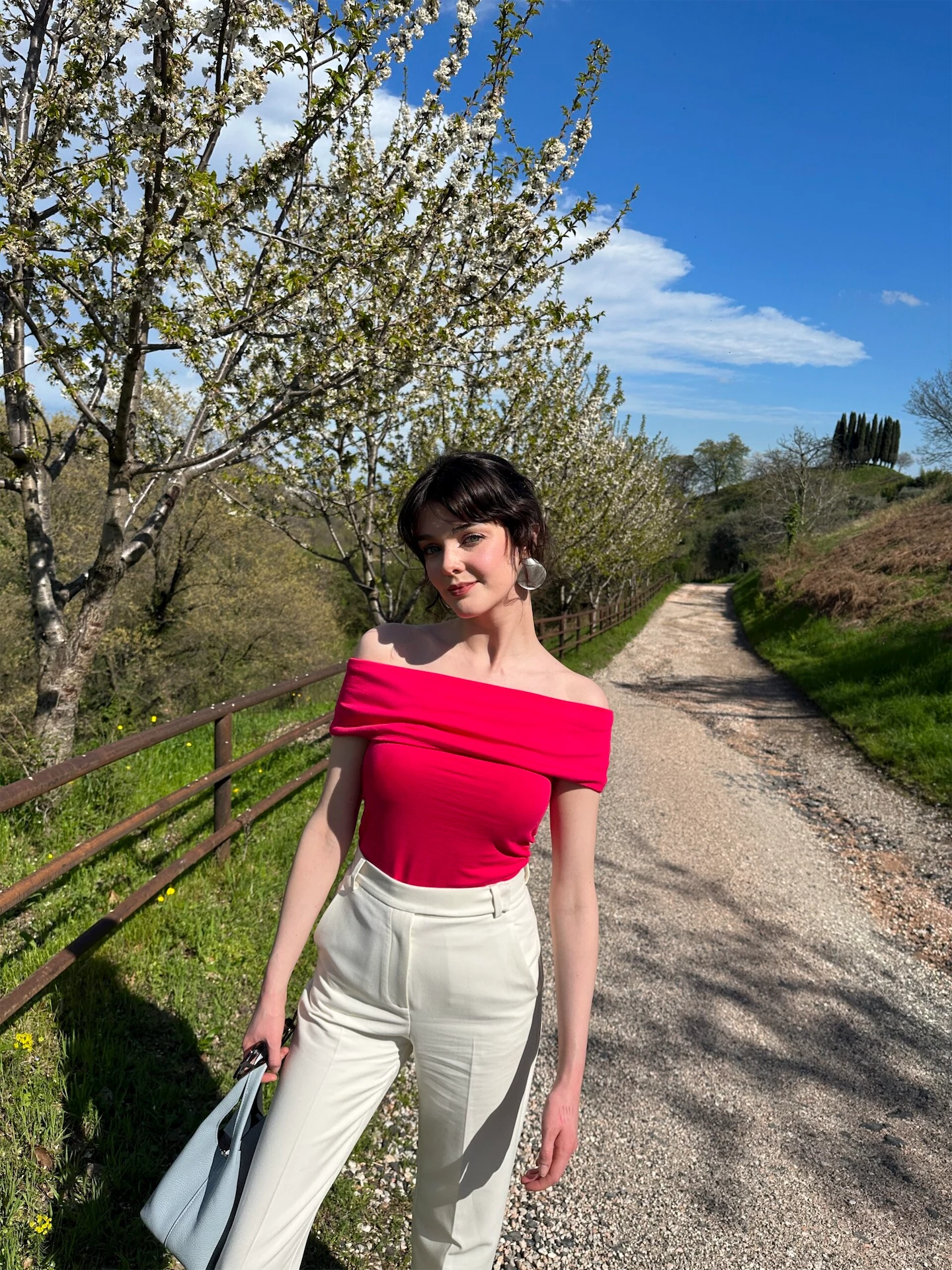 It may be the beginning of the week, but I am finishing up a long weekend trip to Italy. Today we are heading back to Dublin from Verona after spending a few days visiting my boyfriend’s family. We were going for lunch before our flight with his glamorous mum and grandmother, so I wanted to be comfortable but still chic. I chose a pink off-the-shoulder top from Cos, cream trousers from Mango and a pale blue bag which I bought in a little leather shop on a previous trip here. I added a pair of big silver earrings to balance the outfit, as I think delicate accessories would have made this look a bit too straightforward. My style is very simple by nature, so I always try to have small touches that can create contrast, like heaviness when everything else is light. Although I wouldn’t usually wear suit trousers on a flight, I also never really got into the habit of wearing leisurewear while flying. With work, I would often have to go straight to castings or a shoot from the airport, so I always choose my outfits carefully ahead of travelling. Linens and light knits would be my usual go-tos during the summer, but this wasn’t too bad for the relatively short trip back to grey old Dublin.