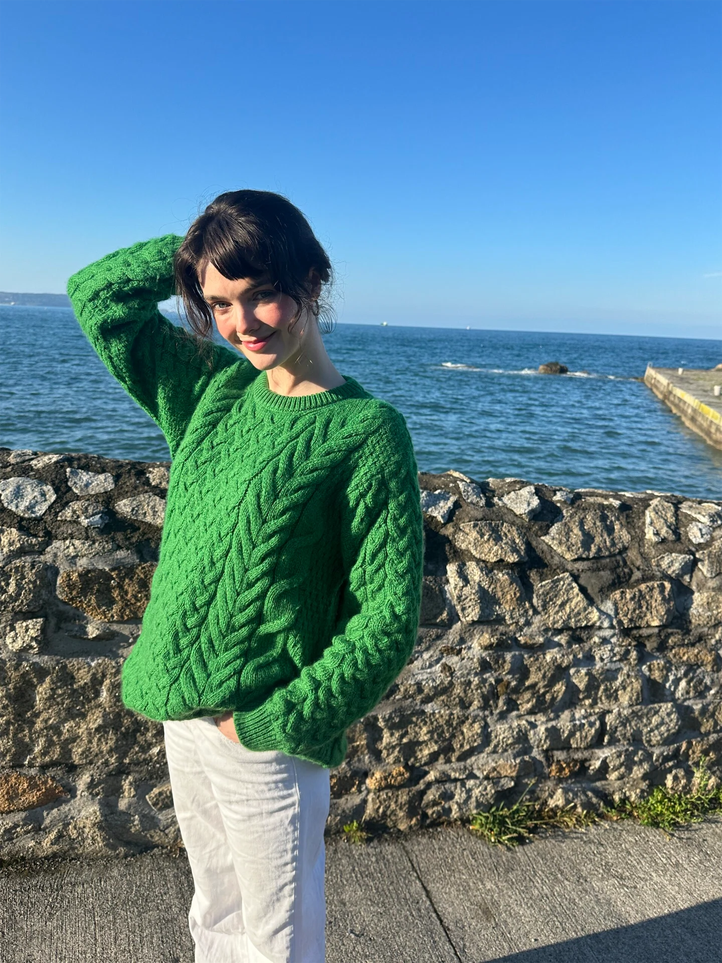 Afterwards, I got changed into my favourite Aran sweater and baggy jeans to go for a long walk around Dalkey. Arans are my favourite jumpers, and I always say you can take me out of Ireland, but you can never take me out of my Arans! I buy a new one in Killarney each year, and this year’s choice was this apple-green version. It does feel quintessentially Irish, but also reminds me of that rich, bright green that was very popular in recent seasons. I always get these jumpers oversized, in the men’s section or the unisex line.