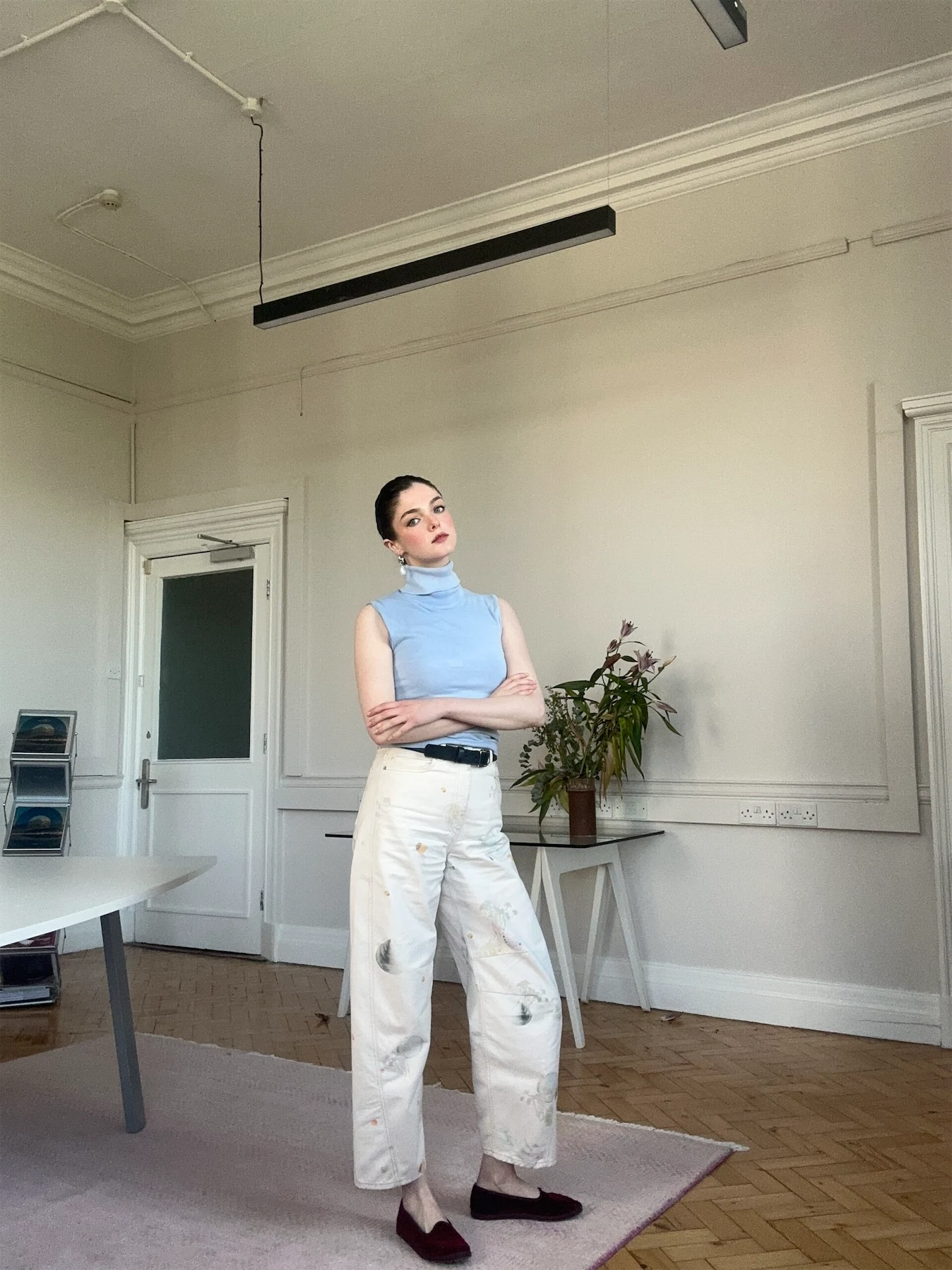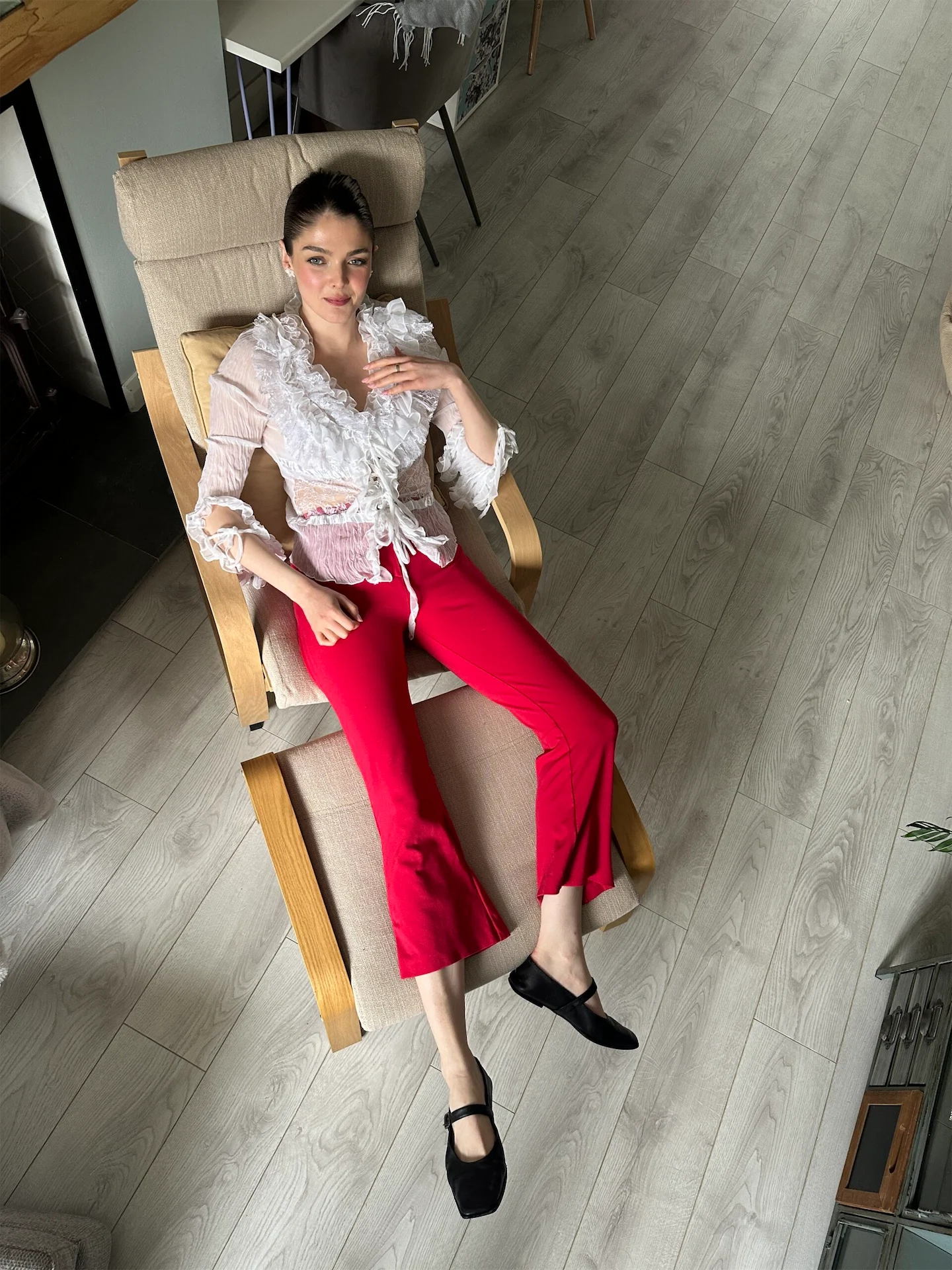 The highlight of today is my boyfriend’s birthday. Here, we were waiting to head out to a relaxed dinner at a lovely Thai restaurant, Baan Thai, to celebrate. I am wearing a vintage blouse which I bought in a little vintage store that I swear used to be on Abbey Street, but sometimes I think maybe it was a hallucination, as I hadn’t been in before and have never seen it since. I receive both compliments and looks of disgust when I wear this, I suppose because the ruffles are quite over the top. I like it though! It appealed to me when I bought it and I still wear it all these years later. I try to wear as much secondhand clothing as I can, there is a great thrill in bagging a great piece, and it is much more sustainable. This blouse is completely transparent, so today I am wearing a cami underneath it, but I have worn it when going out out before with just a cute bra underneath. My red trousers are from Pinko, which is usually one of my first stops whenever I go out to Kildare Village. I am also wearing pearl flower earrings, which were a gift, and Mary Janes from Massimo Dutti. I live in various iterations of ballet flats; they have been a constant staple in my wardrobe since I first watched Roman Holiday fifteen years ago and decided that I loved them. This pair have gotten quite worn since I bought them, but I think leather looks better when it starts to get a bit beaten up. I currently have my eye on a pair of silver Tabis from Maison Margiela, they are on my potential birthday wishlist for my next milestone birthday. I love the Japanese reference, and that they look classic from certain angles until you see them face-on. I think simple outfits are elevated by weird or unexpected elements, which I would like to play with more in my style.
