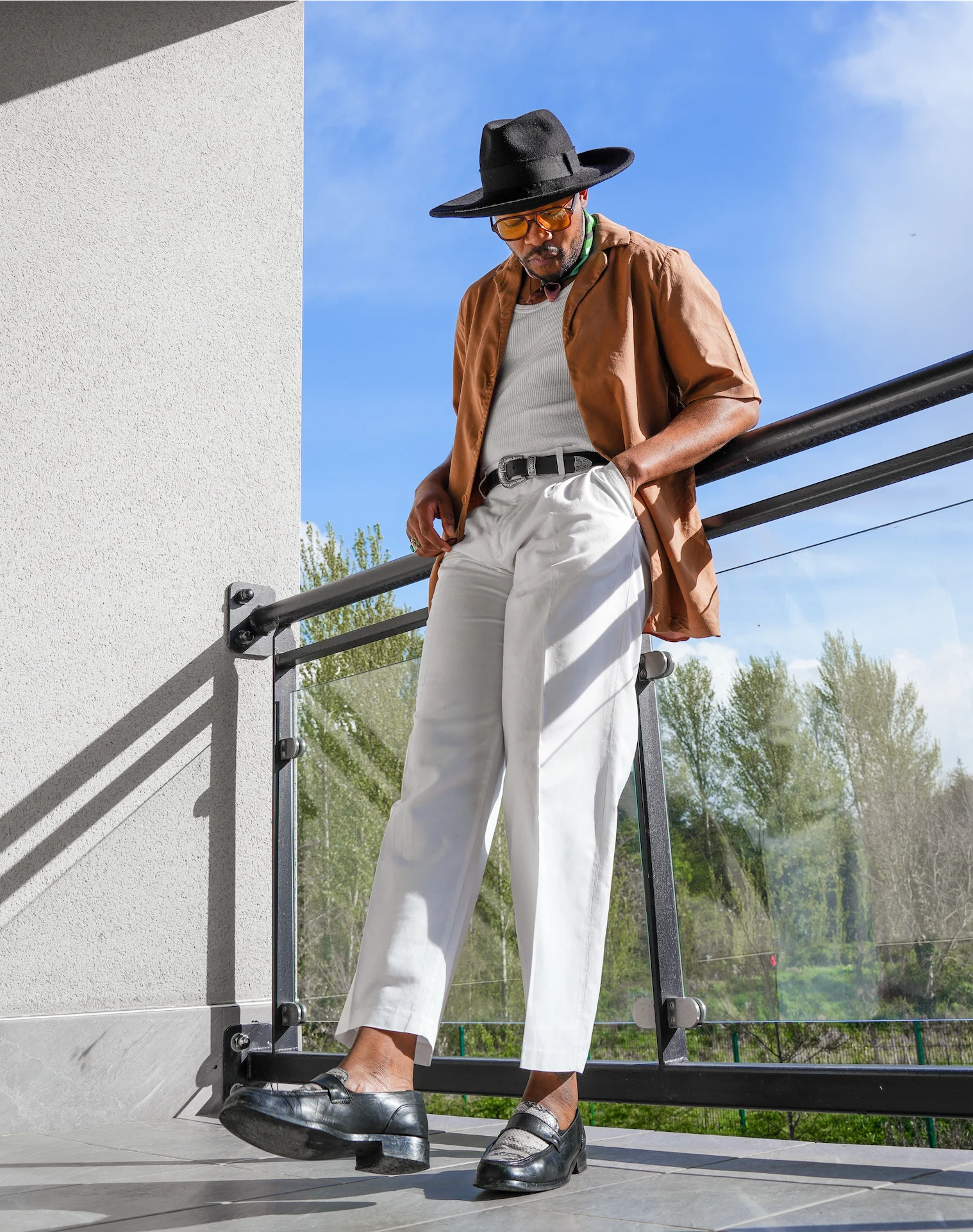 On Friday I like to wear something to turn heads and, weather permitting, I will go for something like this – all white with some black and tobacco tones. When the weather is good, linen pants are a staple for spring/summer. I own 4 pairs for a nice rotation in case they get dirty (white is easy to get dirty, unfortunately). I went for my favourite two-tone penny loafers from ASOS, a shirt from COS, and a silk scarf from Irish designer Tidings. My fedora and sunnies are both as functional as they are aesthetic, especially if it’s sunny out.