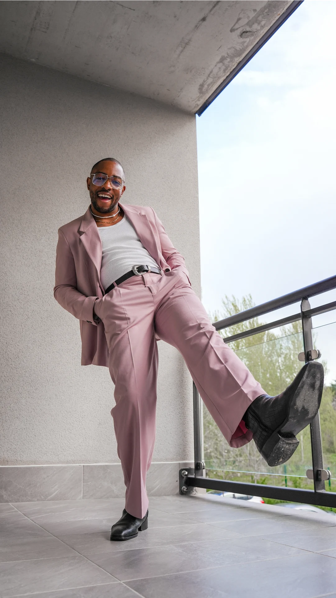 This is a look I wore to a day of events. I needed something that could take me from day to night with ease. It had to be edgy, hence why I went for a tank top, a pearl and gold necklace, and some oversized vintage-style glasses. I kept it simple with a Chelsea boot for my footwear and just like that, my day-to-evening look was complete. The suit is from Zara and the boots are from Kurt Geiger.