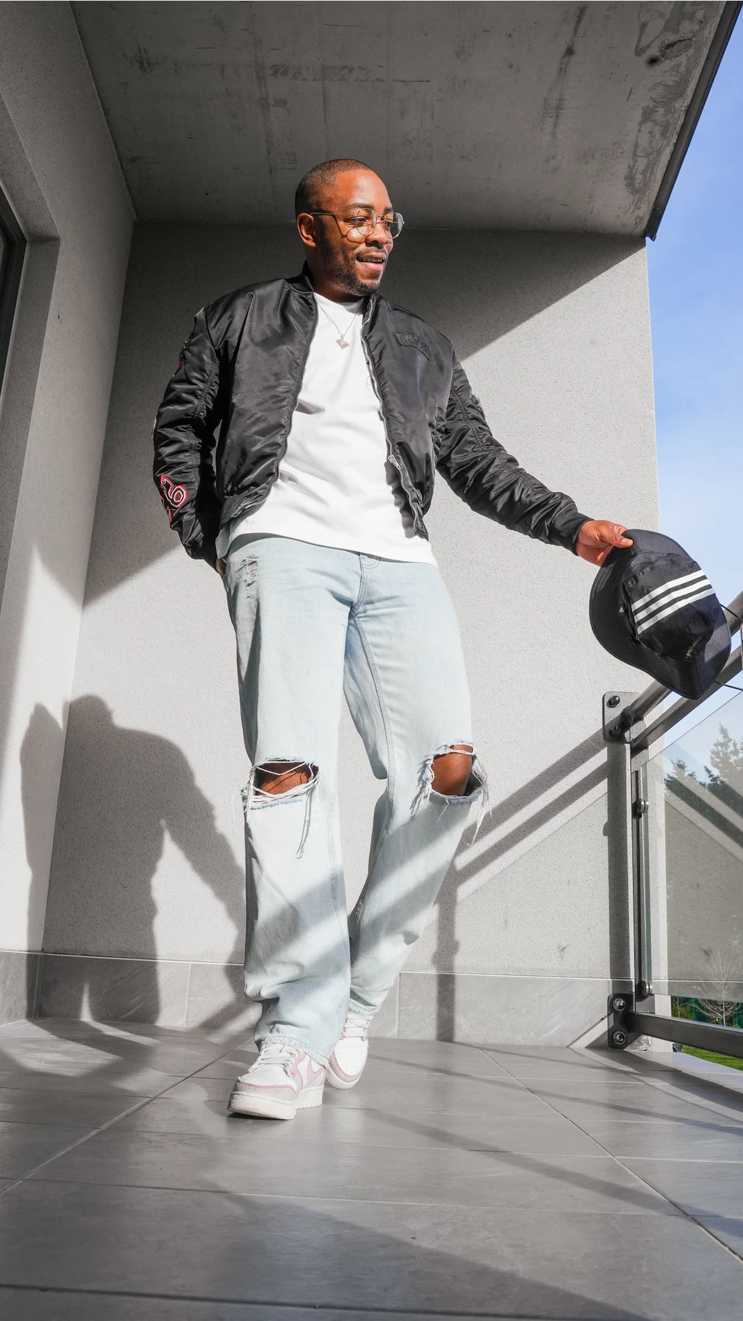 I like to wear street style on Thursday for some reason. I couldn’t tell you why!? It’s a habit I guess. I like wearing oversized jeans at the moment, it means extra room for my legs! These dunks from Nike are a favourite and this bomber from Alexander McQueen is a favourite too. I went with an oversized t-shirt from Zara and tied the look together with a bucket hat from Adidas.