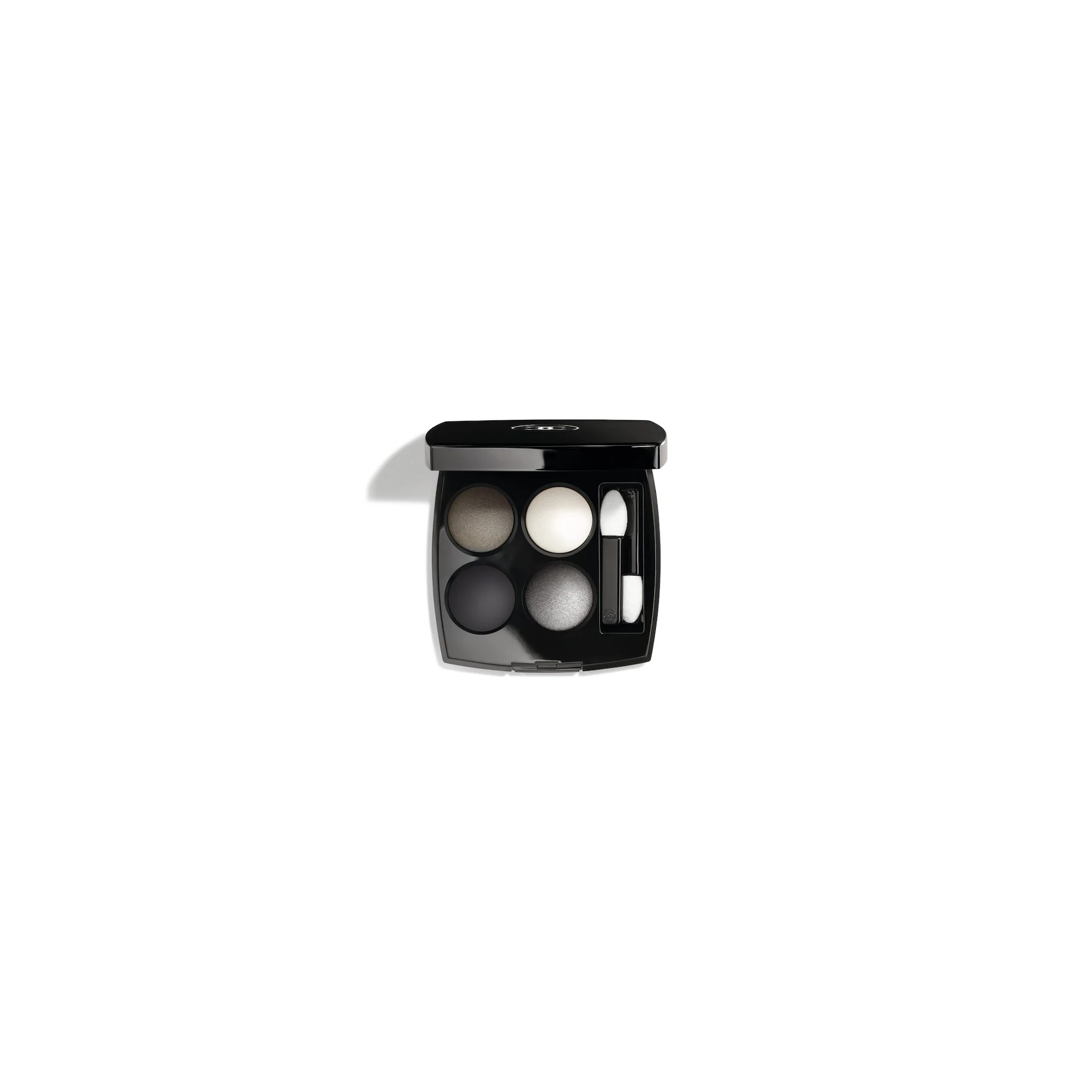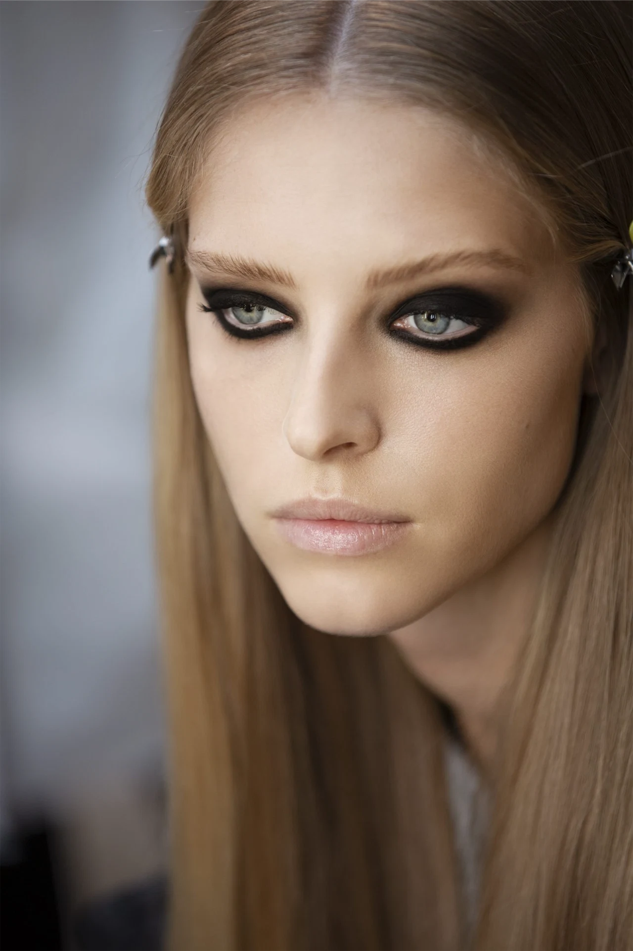 The dramatic, heavy black wings were created using Chanel eyeliner and the Les 4 Ombres eyeshadow in Modern Glamour, €55, with lashings of mascara on top. Models without blackened eyes wore clean, gleaming skin with groomed brows and a natural lip. Hairs was poker-straight hair or naturally textured, with strict center partings and blunt cut bangs.