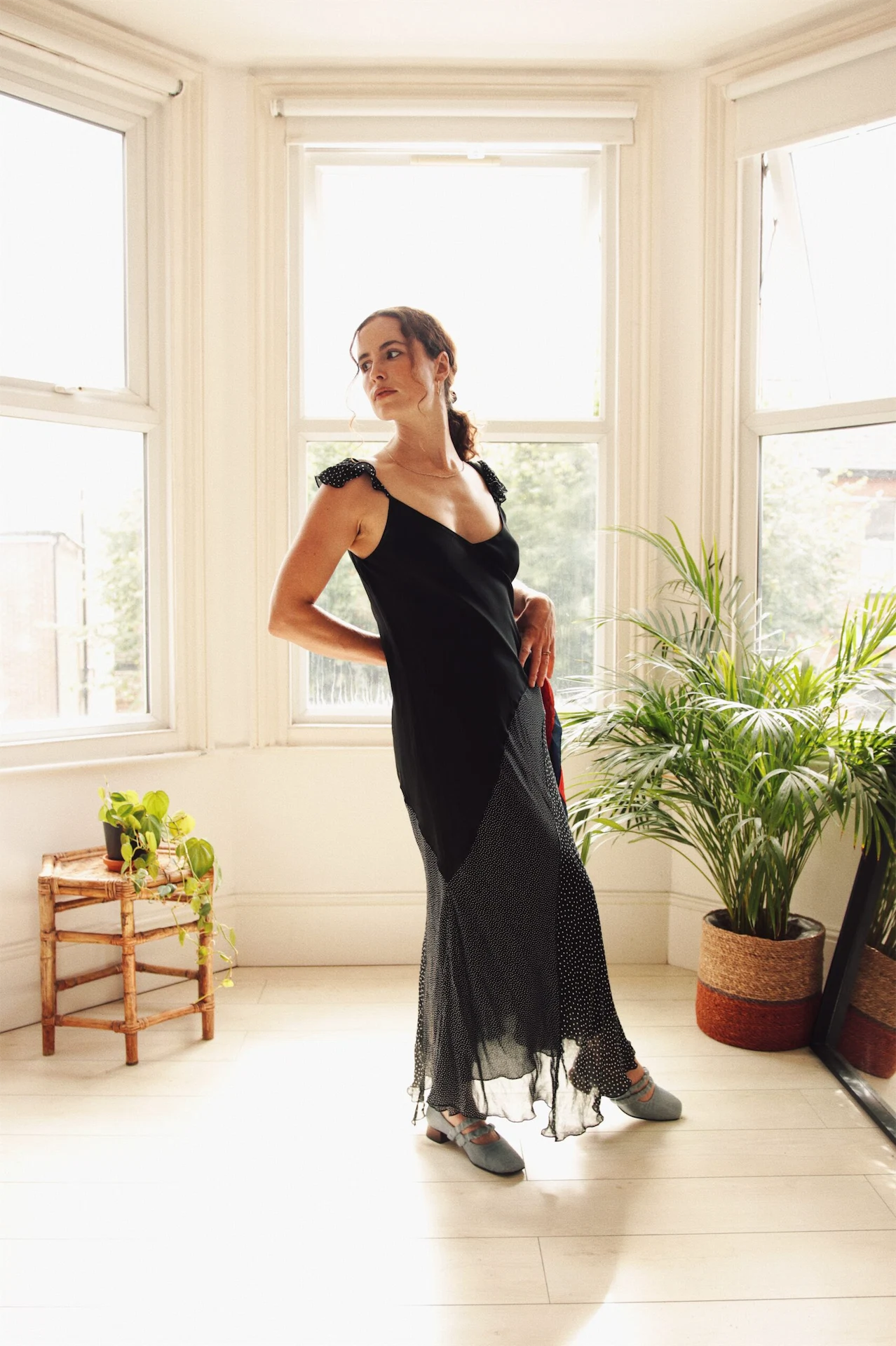 This dress might look like a Rixo design, but it is not, and in my opinion, it’s better. It’s actually a vintage Per Una, and the quality is so weighted and hangs beautifully. I found it on Depop for £16 several years ago. It’s been worn casually, for film premieres and a wedding. The powder blue shoes are super special, and they’re from a small, sustainable brand called Vandrelaar – I highly recommend you check them out.