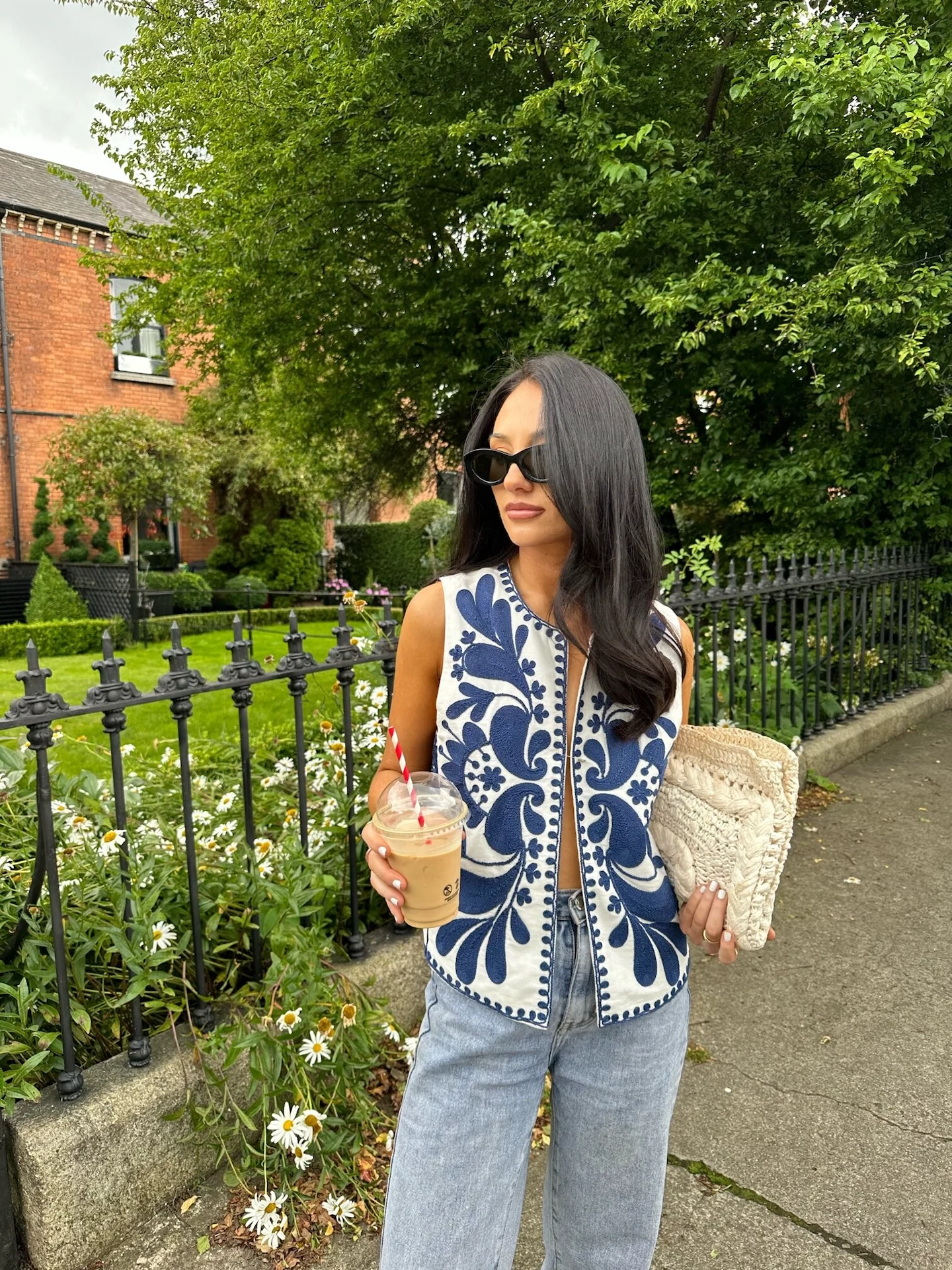 I had a nice quiet day today with my boyfriend. I wore this beautiful embroidered navy and cream waistcoat, Miu Miu sunnies, straight-legged jeans and ballet flats. This is my perfect outfit for an iced coffee and a sunny stroll on a relaxing Sunday afternoon.