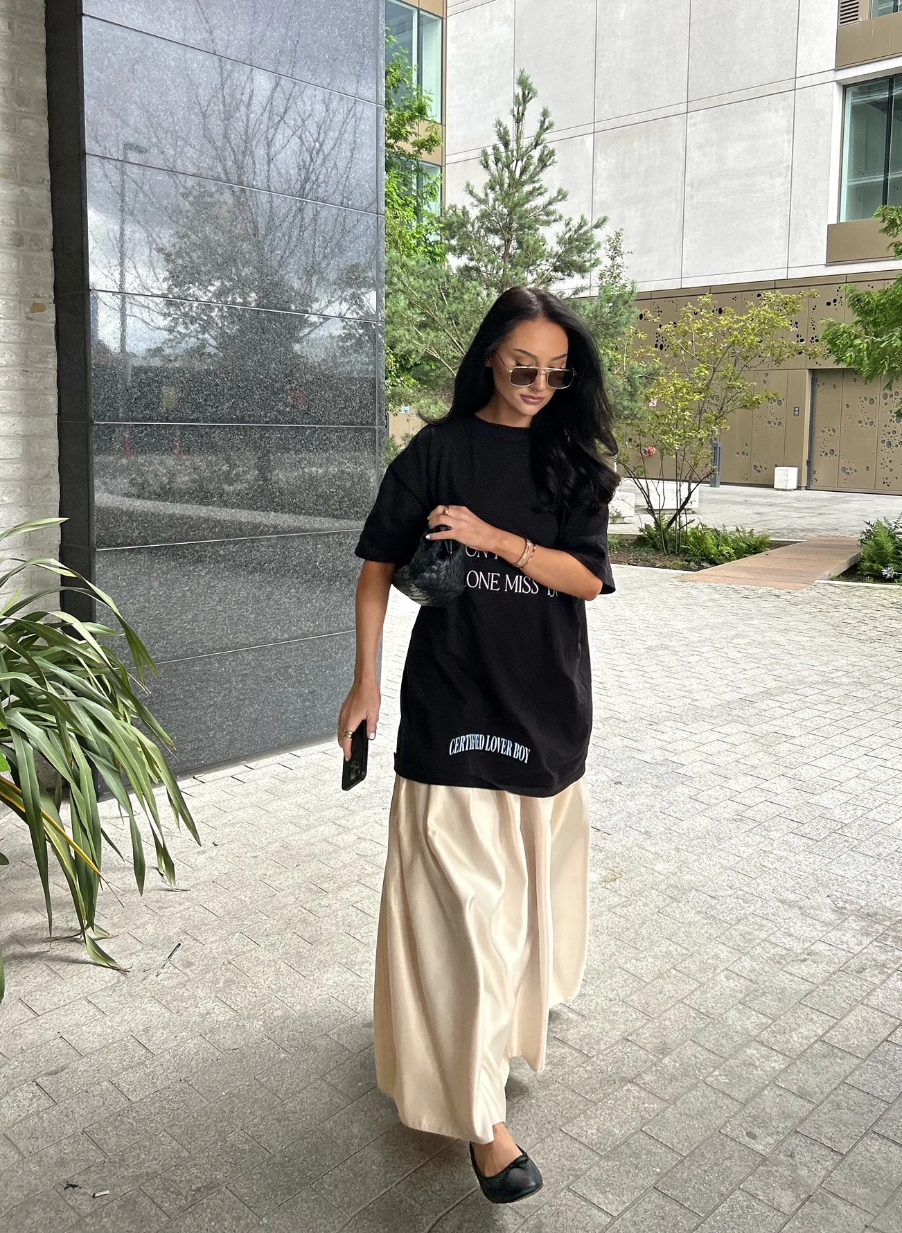 Today I wore this cream satin dress with a T-shirt layered on top. I love the juxtaposition of wearing an oversized men’s T-shirt with a flowy feminine skirt. I think the contrast of the two looks so good together. I teamed it with a little ballet flat making it so comfortable to stroll around in all day. The T-shirt is from the Drake X Nike Certified Lover Boy collection and the skirt is actually a beautiful formal drop waist dress I purchased from ASOS. It’s such a beautiful dress and I thought it was such a shame that I wouldn’t get many settings to wear it to so I wanted to find a way to dress it down and get more use out of it.