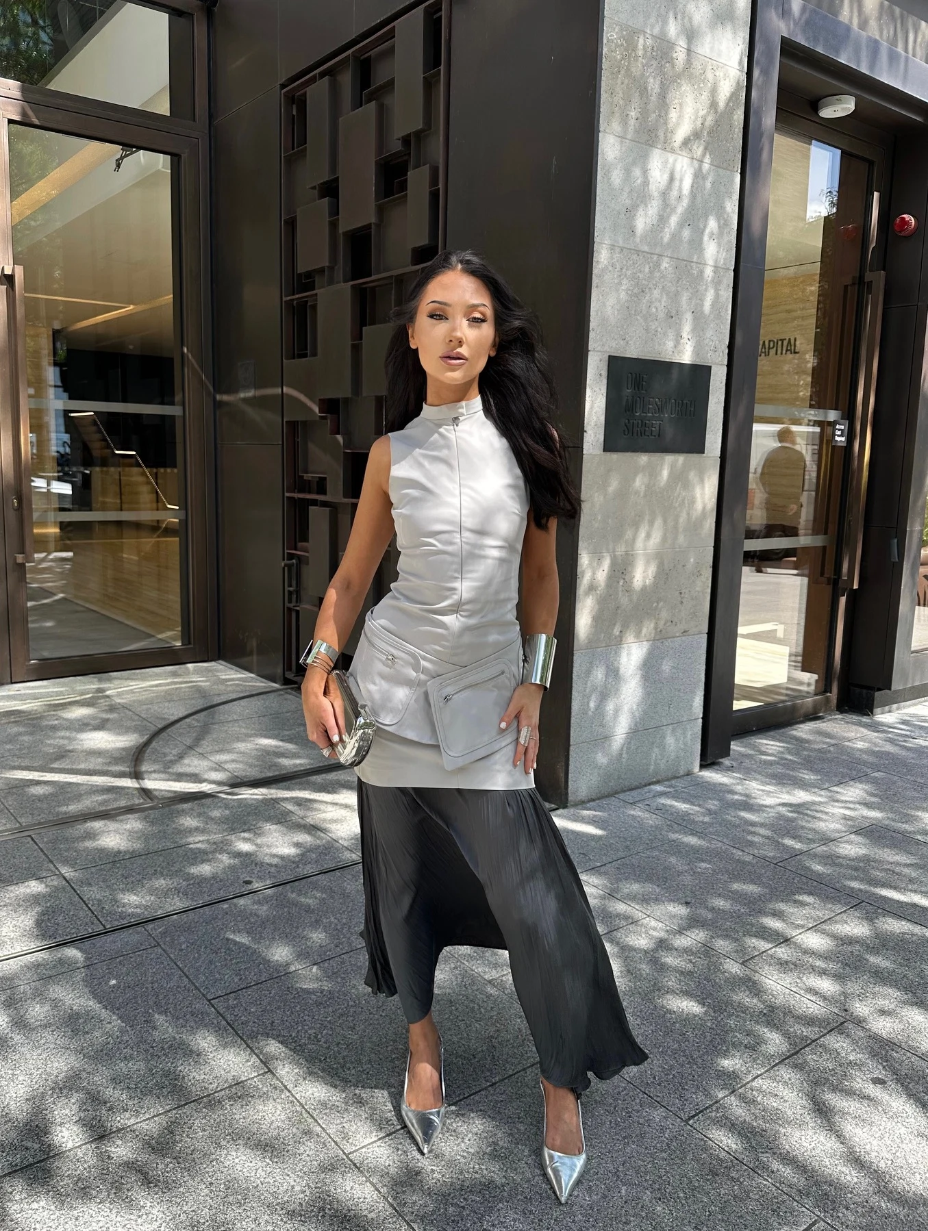 On Wednesday I attended an awards launch night, and to my surprise, I found out I was nominated which was amazing! I wore a grey high-neck combat mini dress from Zara and paired it with a pleated maxi skirt underneath. For accessories, one of my all-time favourite re-emerging trends is chunky silver jewellery – liquid metal rings and large chunky silver cuffs are my absolute go-to accessories at the moment.