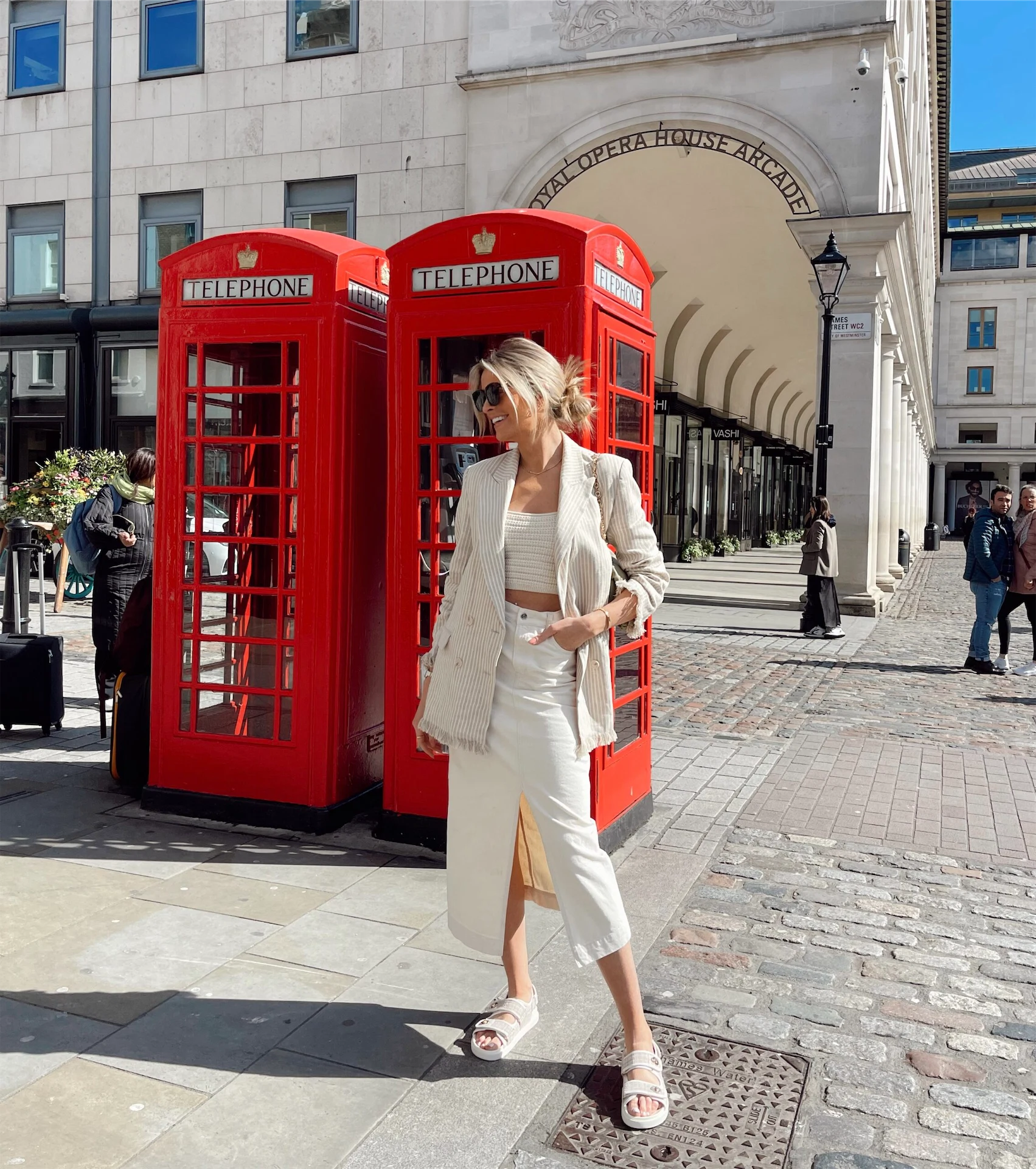 I took the opportunity of a sunny morning in London to break out the summer wardrobe. God knows the sun is taking its time arriving in Ireland this year! This full look is from H&M as I wanted to dress on brand for the trip. I’m loving the denim maxi skirt trend at the moment and this cream one from H&M will be a handy one over the next few months. I will be living in these chunky sandals once the weather allows for it! They’re so comfy. I completed the look with a crochet crop top and linen oversized blazer.
