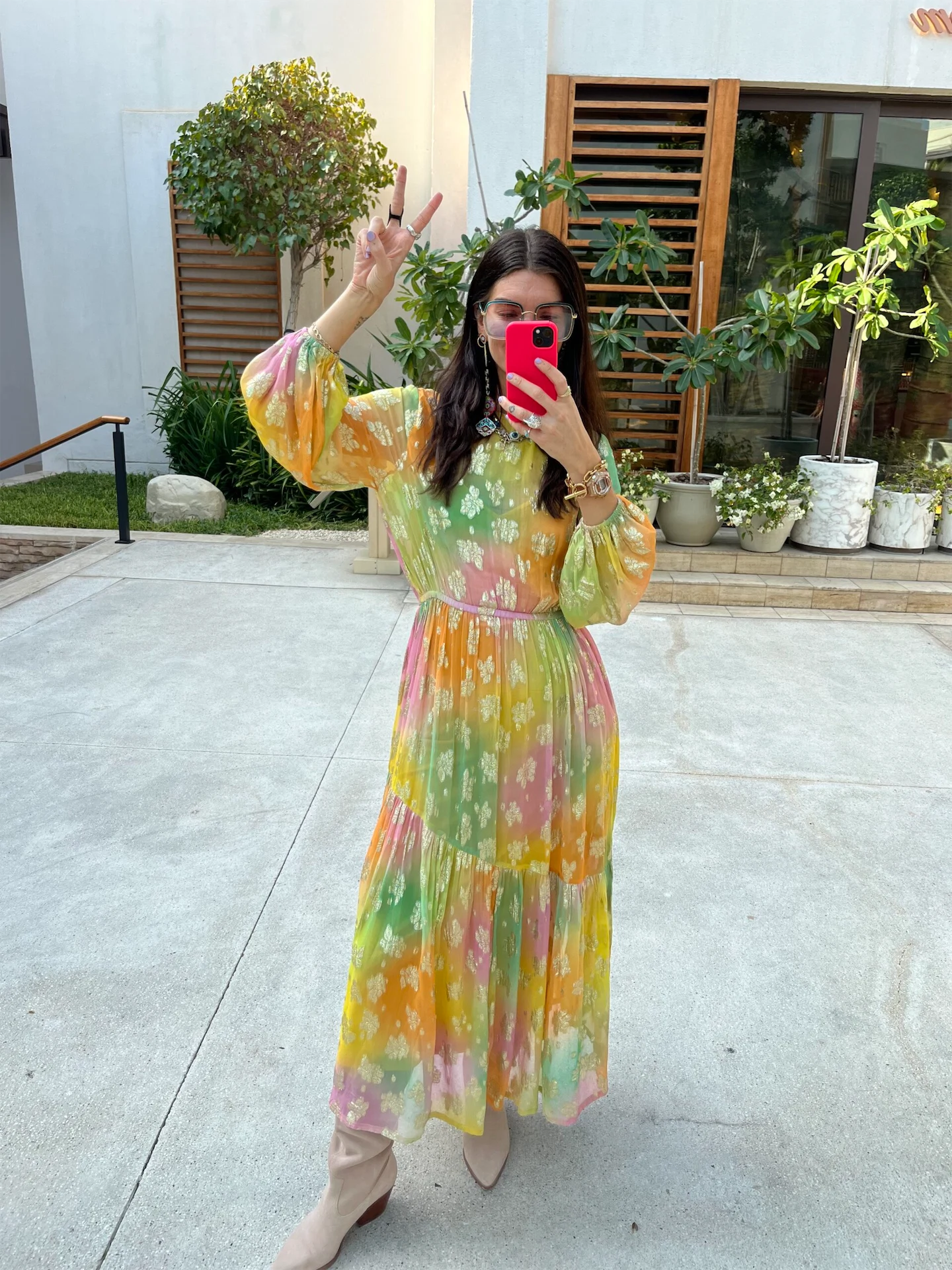 Today is our event day in Dubai where we get to meet some fabulous women showcasing our brand here in true NFD style. I am wearing a dress sample which will be launched later this year. It’s a classic style of ours with a vibrant floral print, paired with our amazing suede cowboy boots – they are an all-time favourite of mine, so versatile. Not forgetting accessories either, with my blue tint sunglasses for a bit of added fun. I love being able to travel and feel so grateful for the customers we have all over the world, seeing women of all ages, shapes and sizes feel amazing in how they look in our clothes is all we could ever wish to achieve.