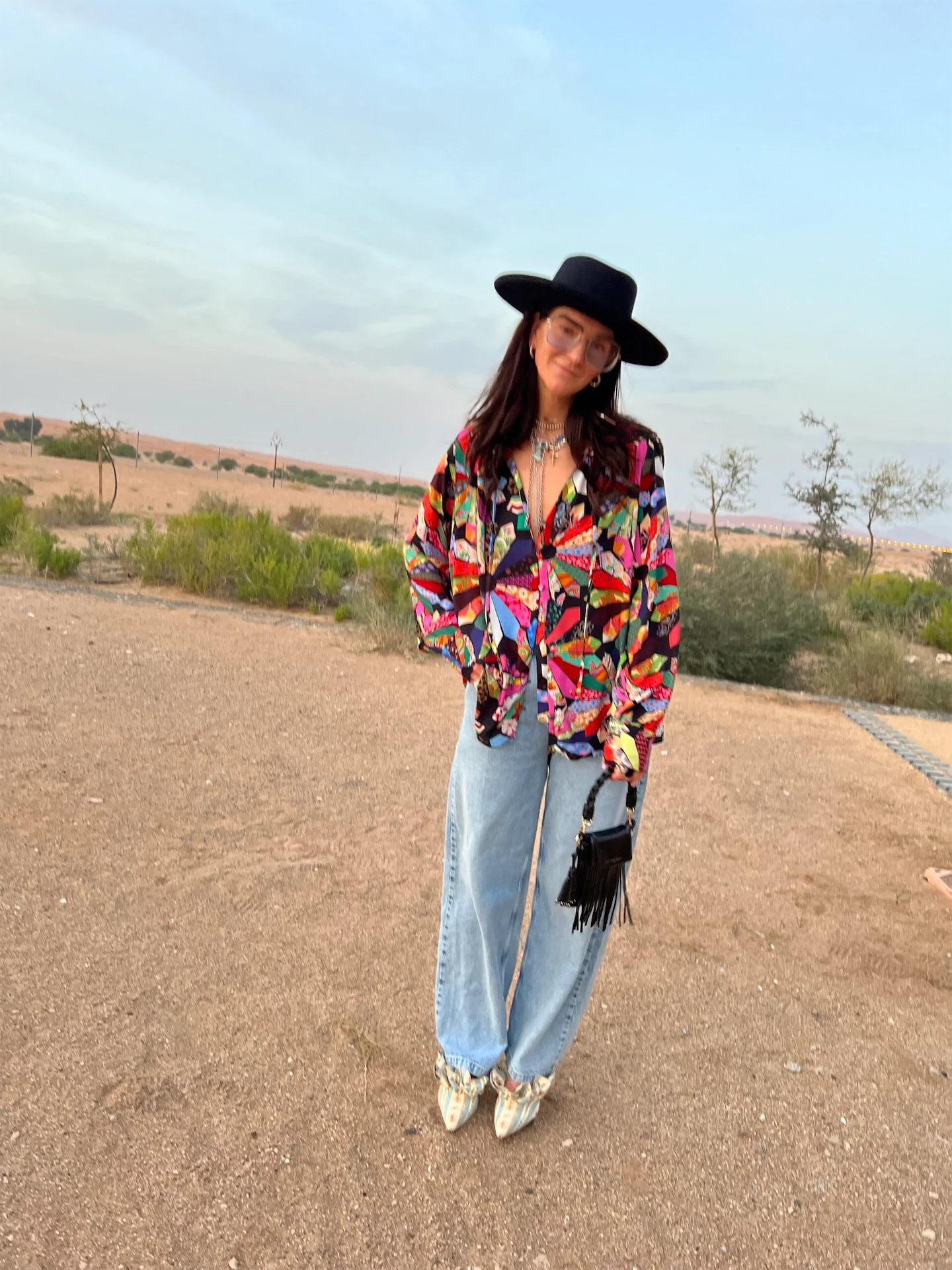 I’m in Dubai for a few days to shoot the Lucy x NFD collection. Feeling very grateful! Travelling and being adventurous when shooting is key for us to deliver the creativity of our prints and the happiness our clothes bring. I shot one of my new pieces, the multi-patchwork shirt which includes iconic NFD prints from over the years – it’s a true step back in time. When styled with classic jeans and Brother Vellies heels, a statement NFD hat and bag, it’s a relaxed look with the loose jeans and oversized shirt, yet still feminine with the printed statement heels.