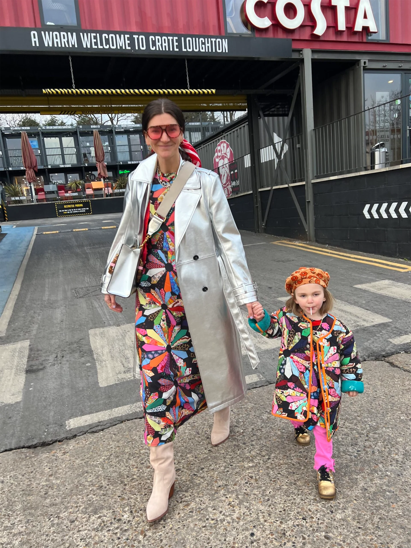 Sunday is my rest day, a day with my family getting some fresh air, fresh flowers and a good lunch. We usually drive to East London and meet my sister who recently moved there for a stroll down Columbia Road flower market followed by a stop off at the pub. Matching with my mini-me just got even better with the Lucy x NFD collection, bringing our hero prints to life across 2 beautiful patchwork dresses. I styled this look with a silver Gucci bag, NFD suede cowboy boots (told you they’re my favourite!) and a silver sample jacket. Forrest is wearing pink flares, gold Dr Martens and of course, a beret.
