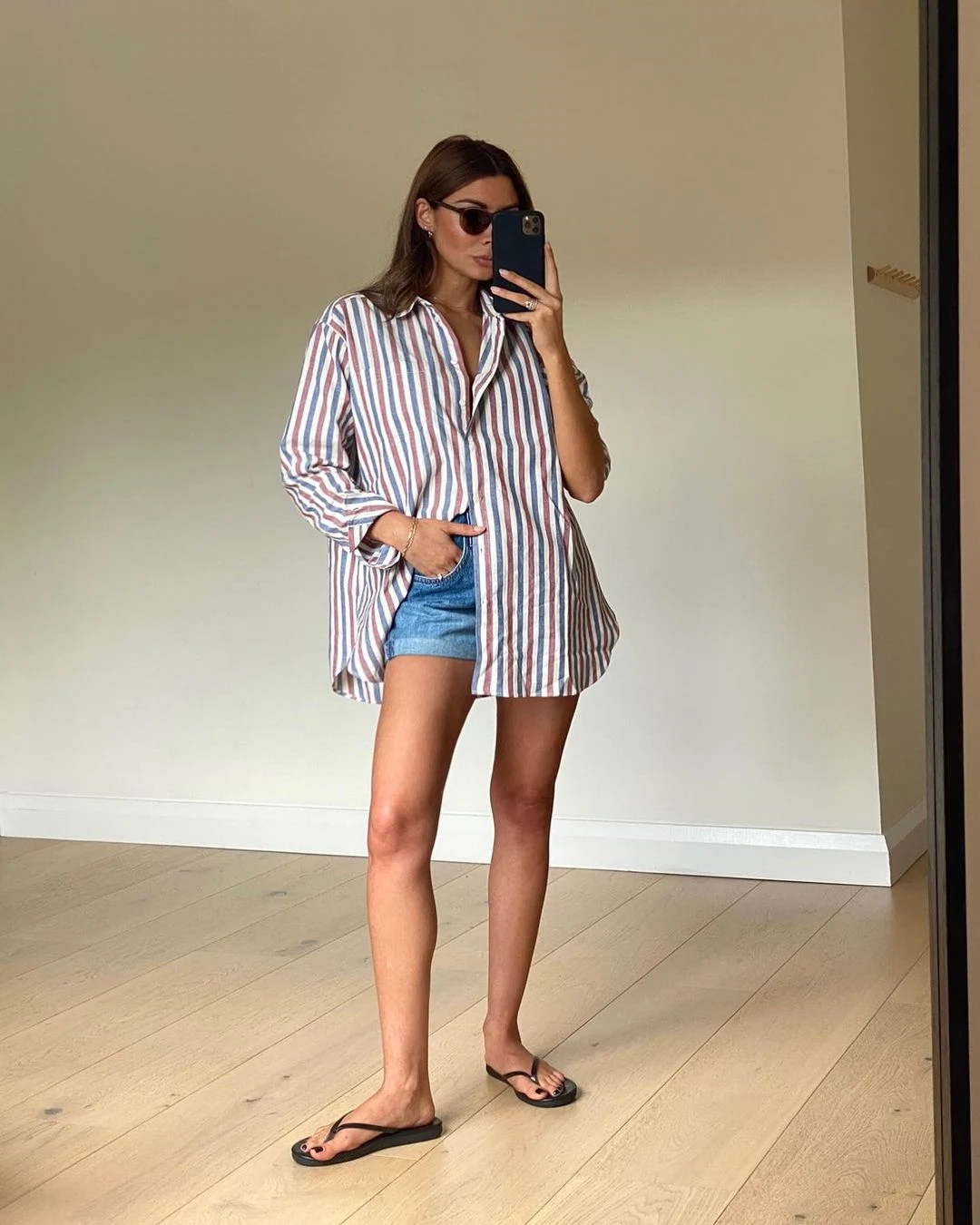 A red stripe shirt for summer, yes, please. Pair this With Nothing Underneath boyfriend shirt with relaxed long denim jeans and sandals for that effortless look.
