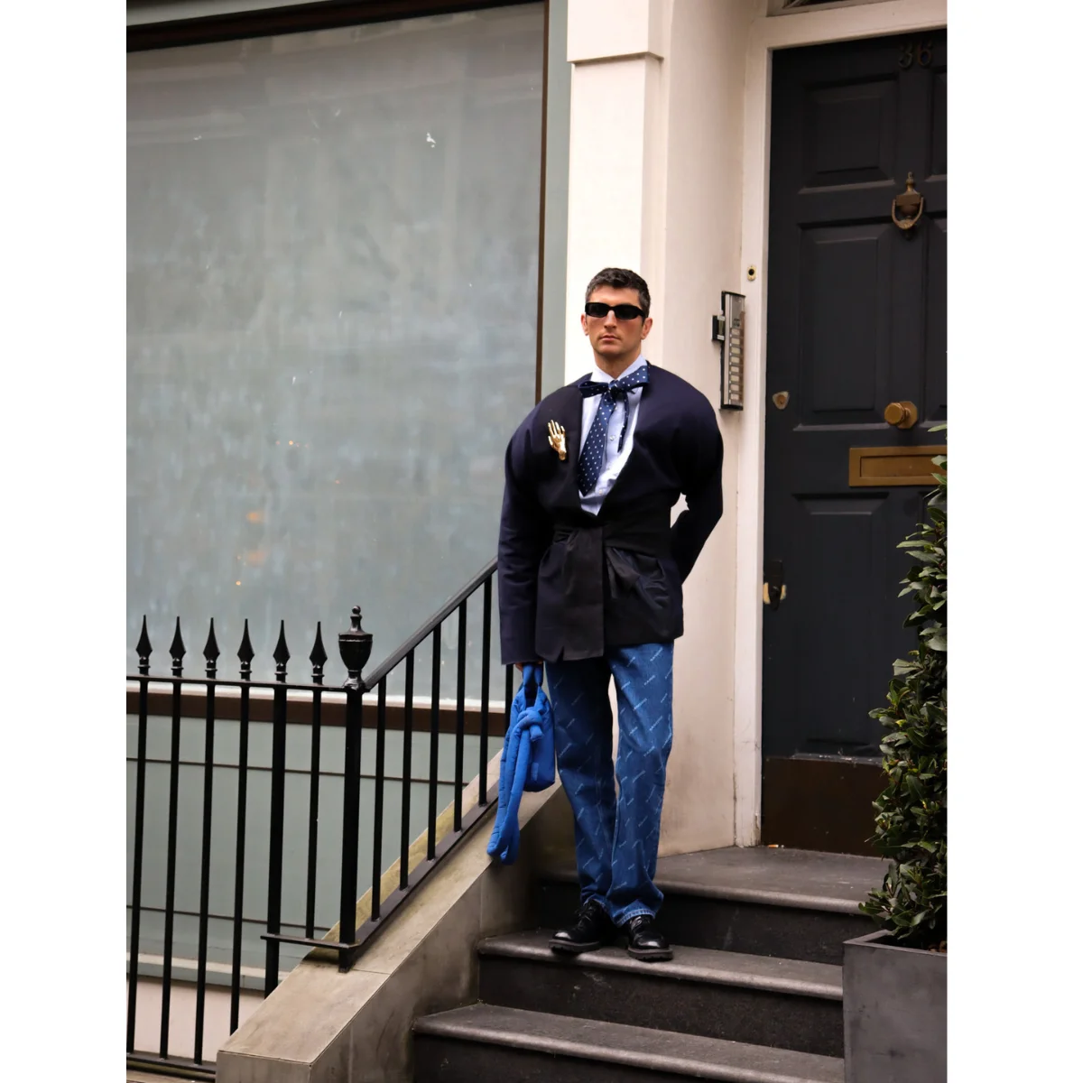 Friday was a busy one, with shows across London beginning at Bora Aksu in Covent Garden, so I needed something that could transition seamlessly from day to night. I kept the Irish thread running on Friday, wearing Conor O’Brien’s Navy Shoulder Pad Jacket from his debut collection, Phantom Thread. I styled it with a gold hand brooch, which I absolutely adore and a polka-dot tie, one of my go-tos, reworked into a bow for a little elevated feel, and finished it off with some very simple black shades I wore everywhere that week.