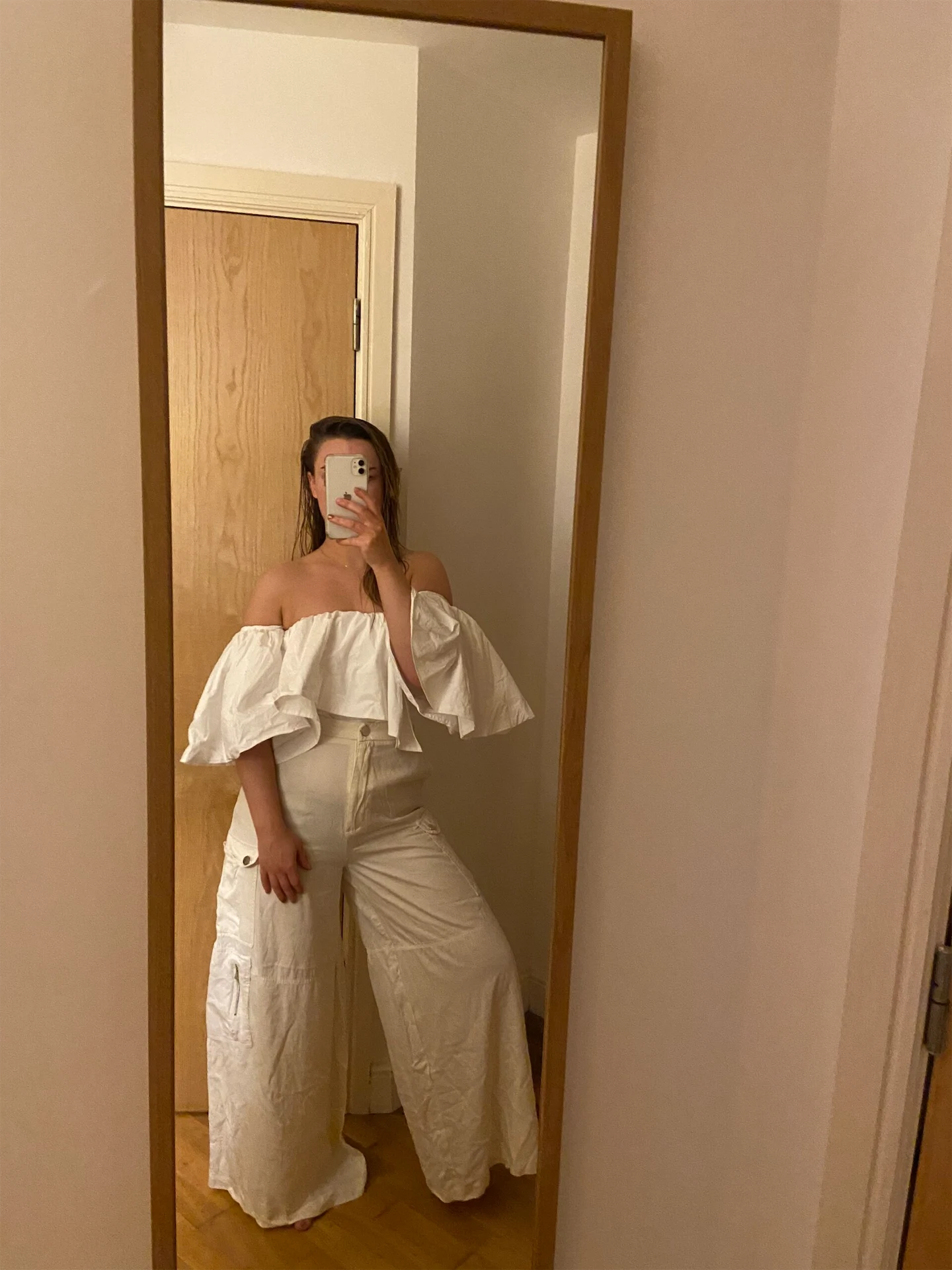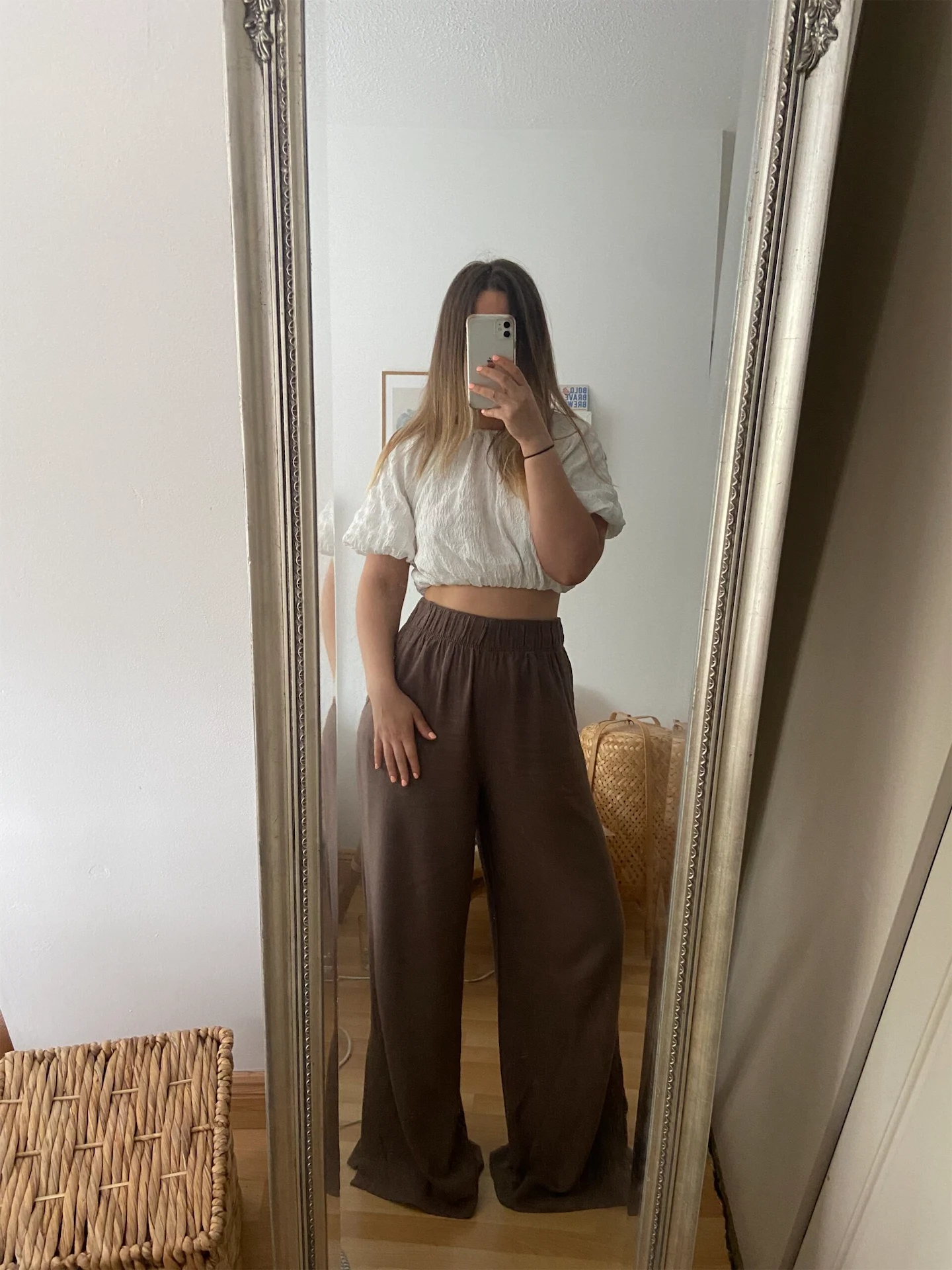 Shoot prep days mean comfy trousers and a cute top. Neutral shades in browns, creams and whites are usually my go-to if I’m not in head-to-toe black. I love colour and pattern on others, but for me, I like to keep things simple and tend to lean into earthy tones and fabrics. I adore linen all year round, although it really is a great summer fabric. You’ll find me in a version of these wide-leg linen trousers from H&M most days. Dressing for your shape is important. A high-waisted wide-leg pant gives me the best shape. This is also where I feel most comfortable. I don’t love anything being too clingy or stuck to my body. Especially if I am running around town picking up clothes and trying to prep for a shoot. This cropped top from River Island is giving me a Cecilie Bahnsen feel. They do the most incredible dream-like silhouettes. Anything with a puffy sleeve I am here for!