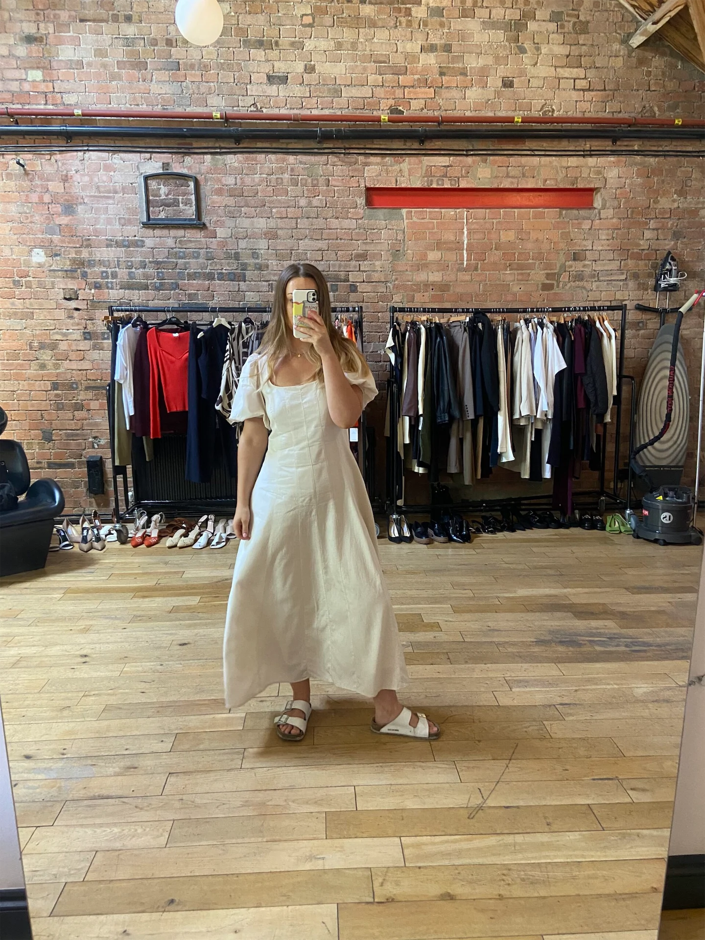 A day on set in a cream midi dress… not the most practical depending on the shoot but this one is super comfy and again, has a floatiness that I love. I have always leaned towards dresses, mostly out of laziness. It’s a one-stop shop for looking put together. You don’t have to worry about which top will go with what skirt/trousers. This dress is from & Other Stories and has the same slightly puffed sleeve that I love. They tend to do a similar silhouette most years and their fabrics always feel really nice. The second the sun starts to make an appearance, my Birkenstocks come out and won’t leave my feet until late September. They are such a great fit if you have wide feet like me! Super comfy and they go with most outfits.