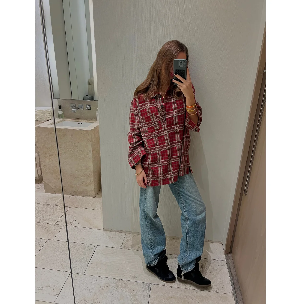 If I had to pick one brand to wear for the rest of my life, it would have to be Isabel Marant. With drop-shoulder balloon sleeves, boho-inspired dresses and skirts, I’ve never had a bad day in an Isabel Marant outfit. And of course, the return of 2016’s most iconic wedge sneaker! I still remember sneaking my mum’s magazines to see Sienna Miller or Gisele Bündchen wearing them, never knowing how I’d ever get a pair. Ten years later, here I am, stomping around in them, delighted with myself. The flannel and Beckett sneakers are both from Isabel Marant, and my jeans are a super-old Citizens of Humanity pair.