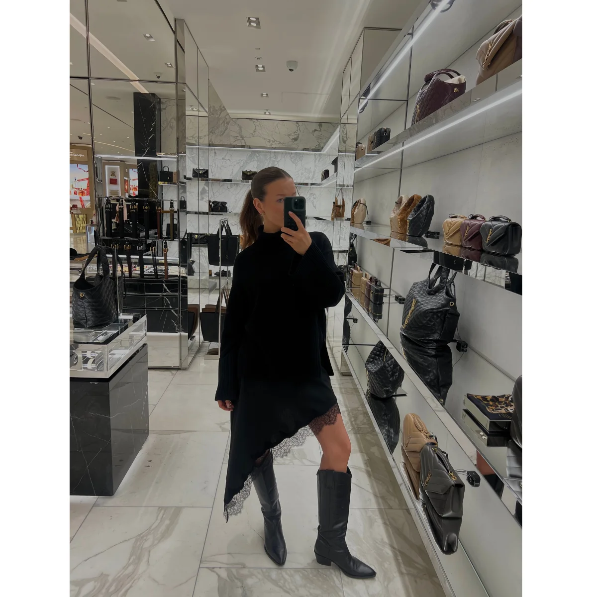 When I say this Totême roll-neck jumper has seen every era of my early twenties, I truly mean it. I’ve worn it to work, to the club, and even to funerals. I don’t know if that’s impressive or slightly embarrassing. I’m loving this super-cool asymmetric skirt from Zara and can’t wait to style it more once the weather brightens up. My trusty cowboy boots are also from Zara.