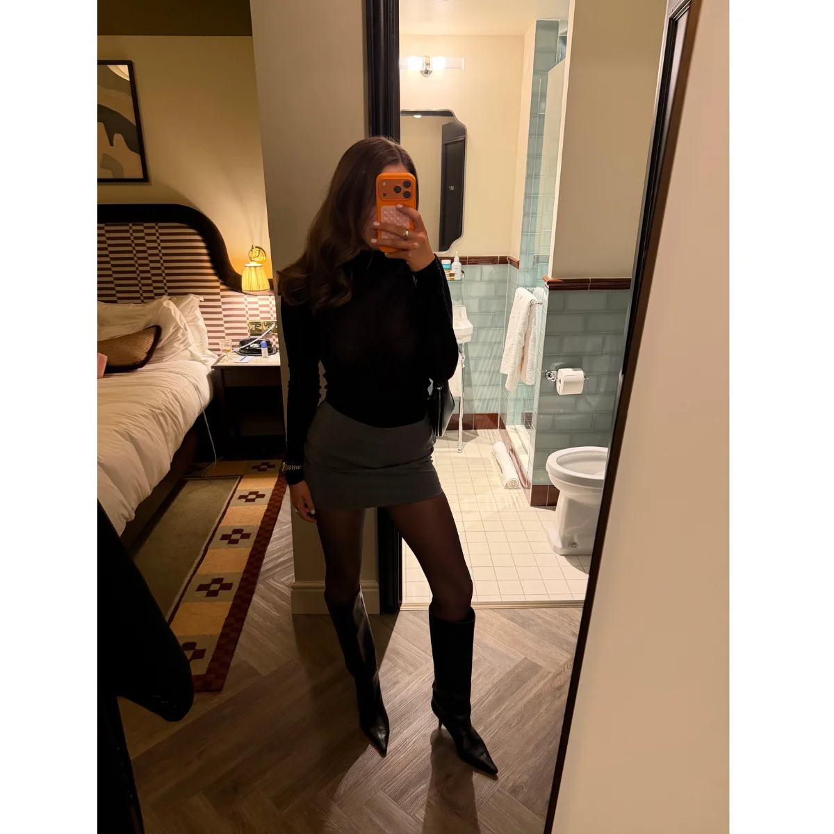 Date night. My mum always taught me that less is more, especially for evening looks. I feel my sexiest in simple, clean outfits, perfect for a dinner date. I picked up this mini skirt at Primark last week and couldn’t believe how high-end it looked when paired with a semi-sheer American Vintage polo neck, unbeatable Wolford tights, and my trusty boots from H&M, which I’ve had resoled three times because I refuse to let them go. The bag of the night is from Alaïa.